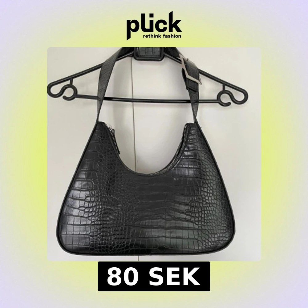 Stilren svart axelväska med crocopräglat mönster och bred axelrem med silverfärgat spänne. Väskan har dragkedja upptill.