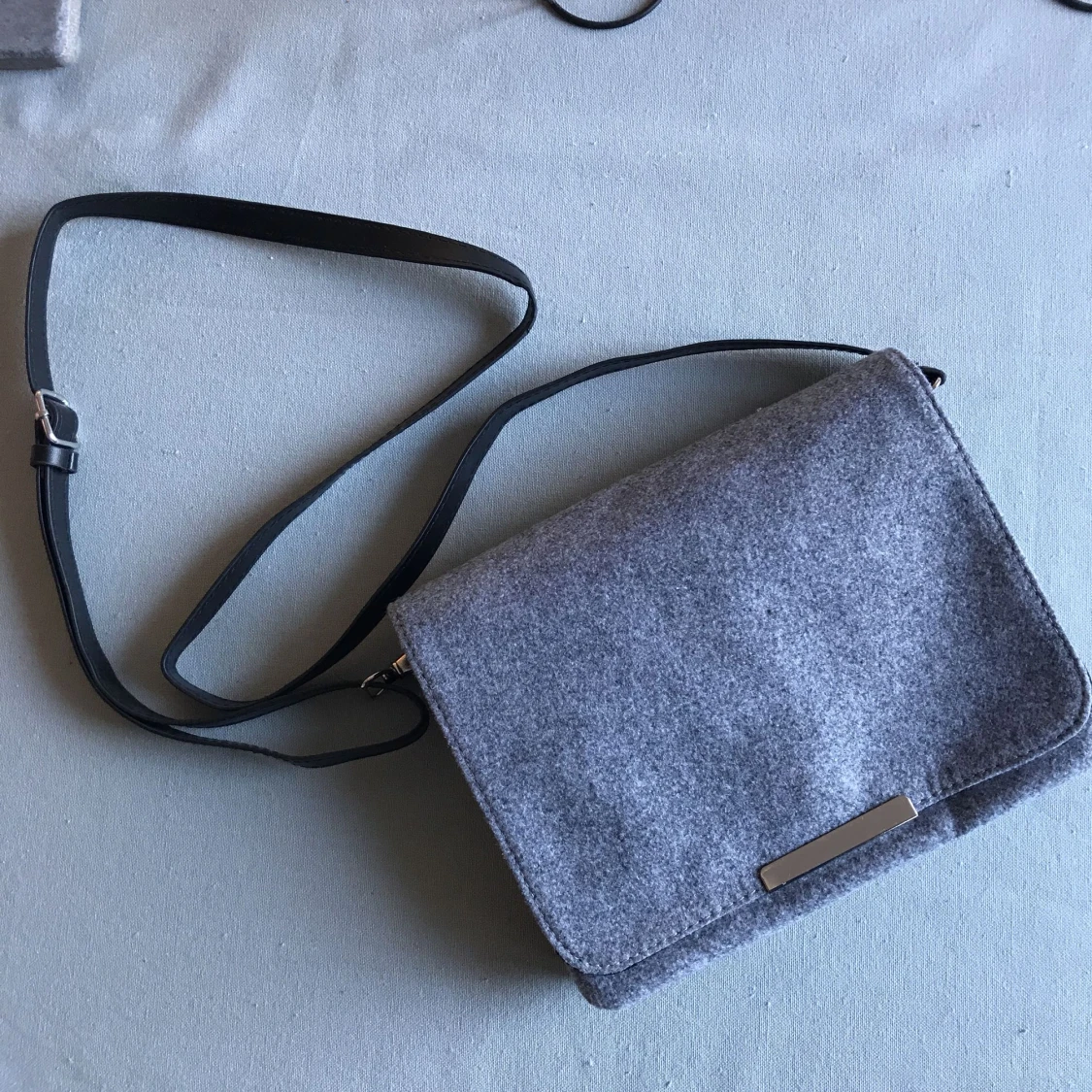 Helt oanvänd handväska i mjukt grått tyg, flera fack och justerbar rem