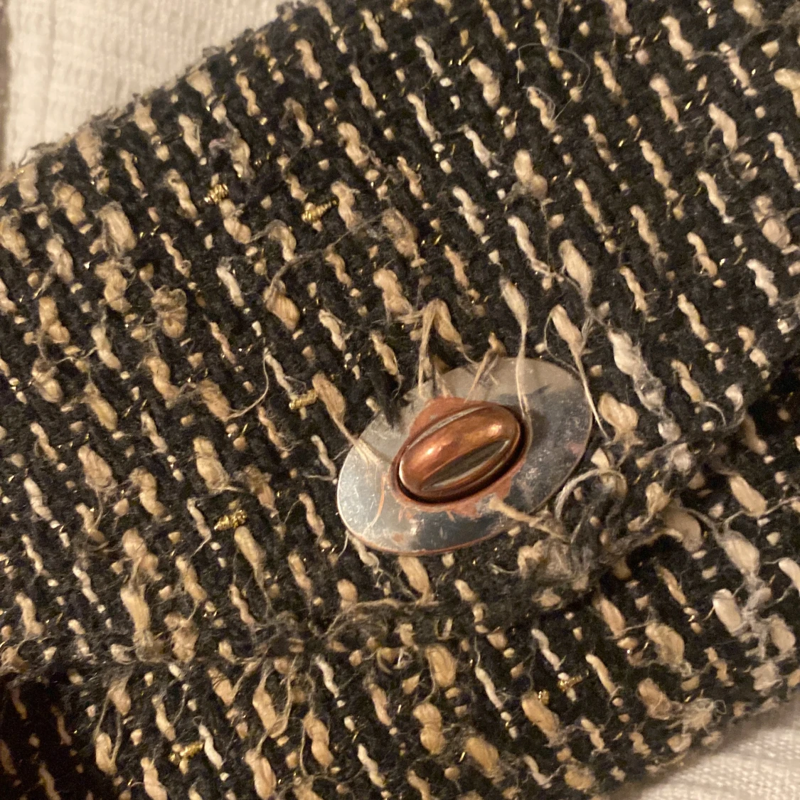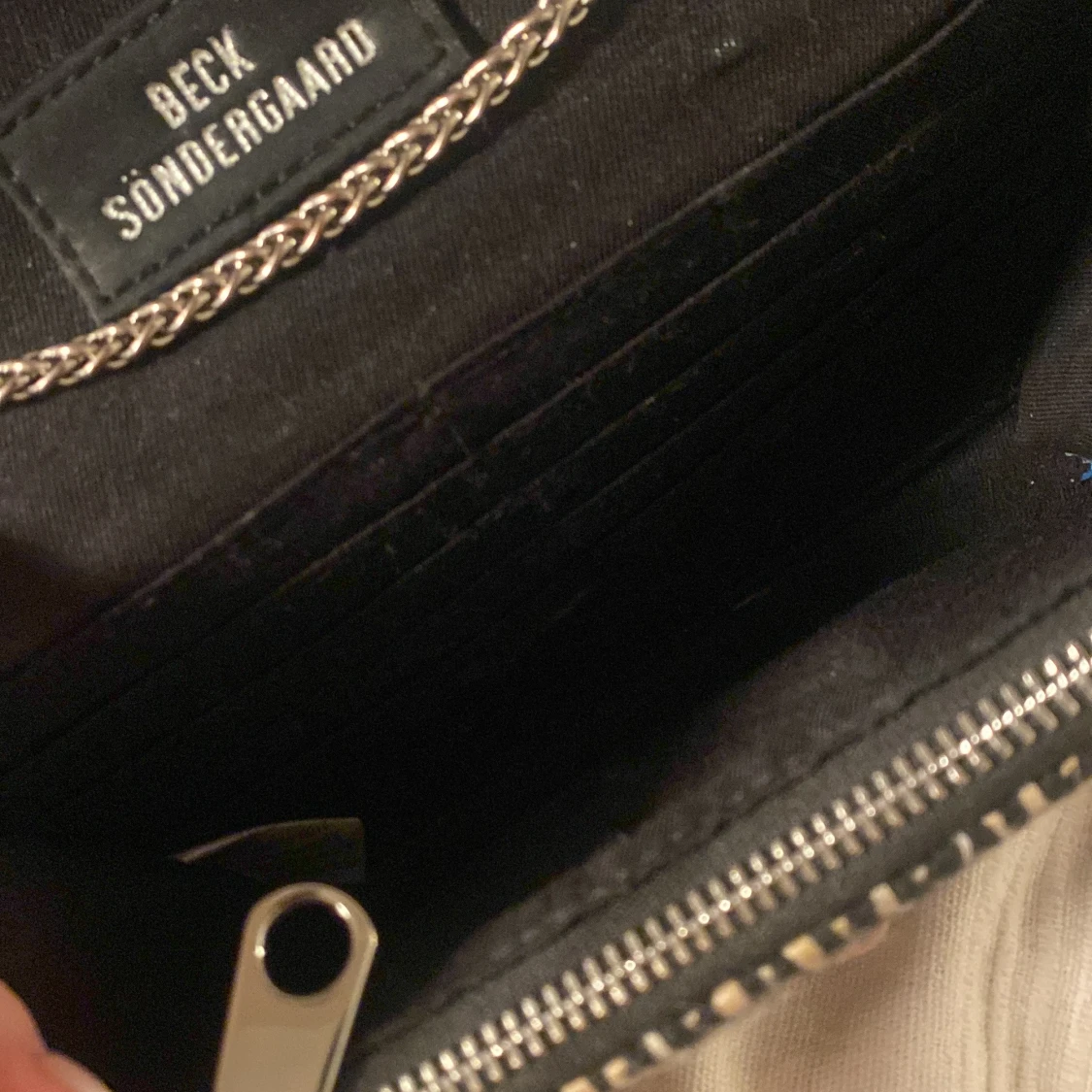 Snygg axelväska från Beck Söndergaard med ett unikt mönster i svart och beige. Väskan har en silvrig kedjerem och ett elegant spänne framtill. Perfekt för att ge din outfit en stilfull touch. Små slitningar vid öppning men ingenting man tänker på, därav pris (se sista bilden)