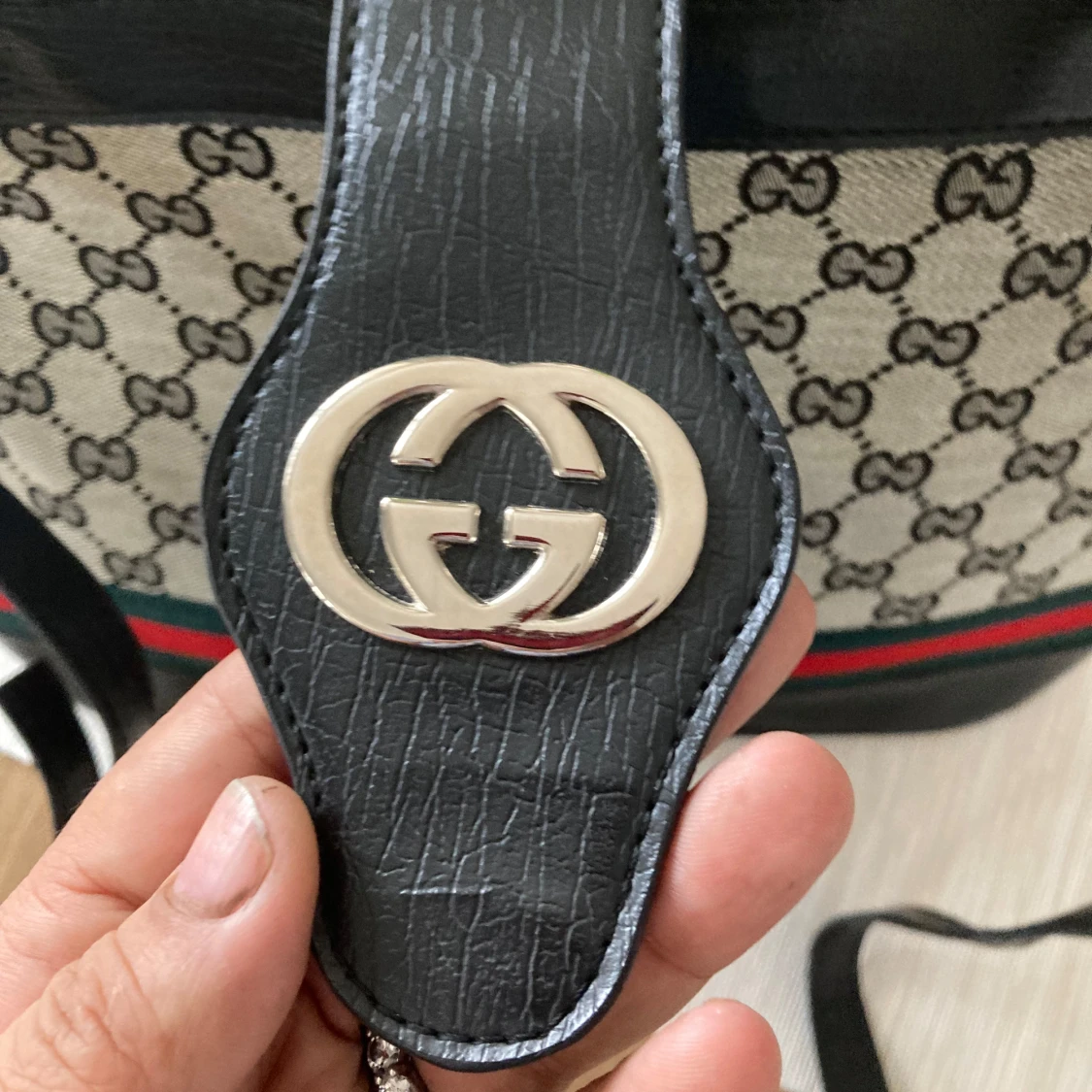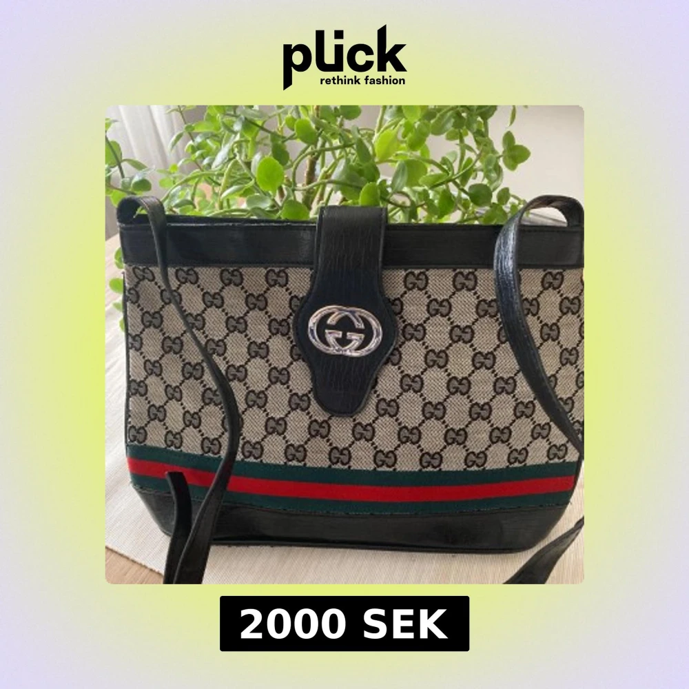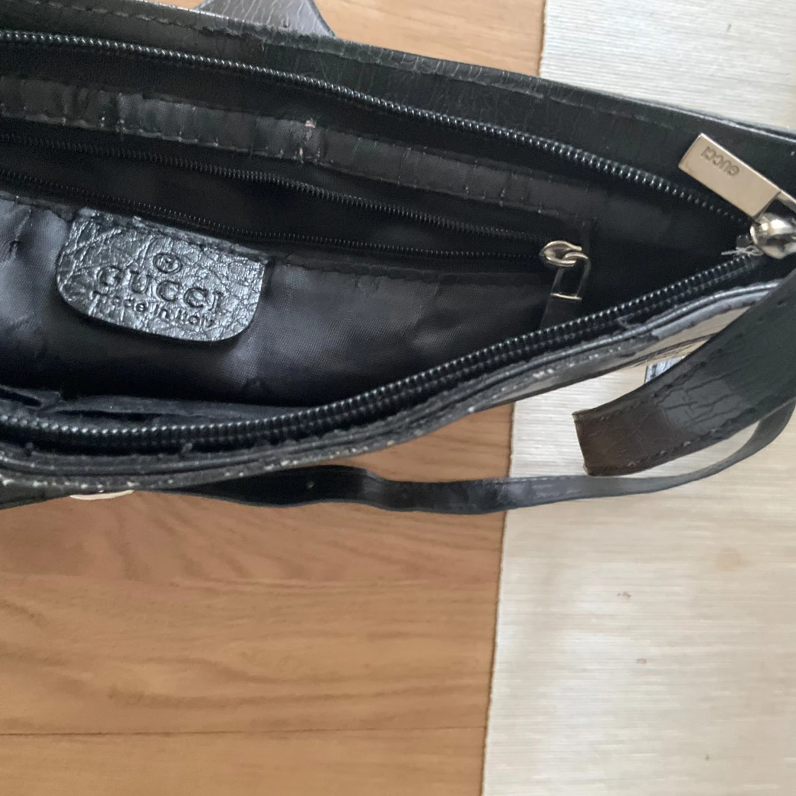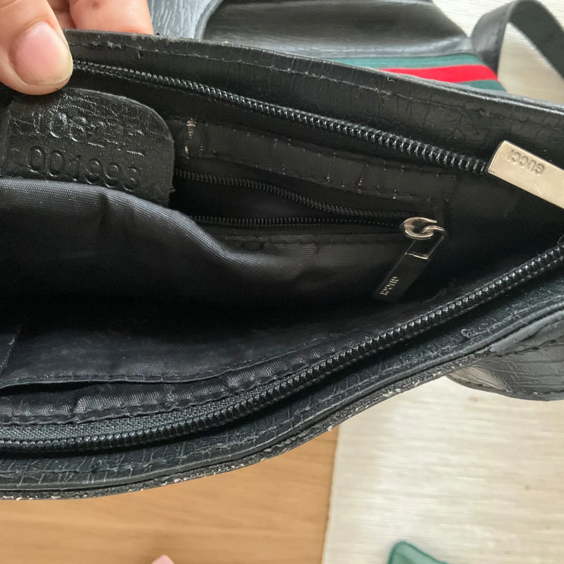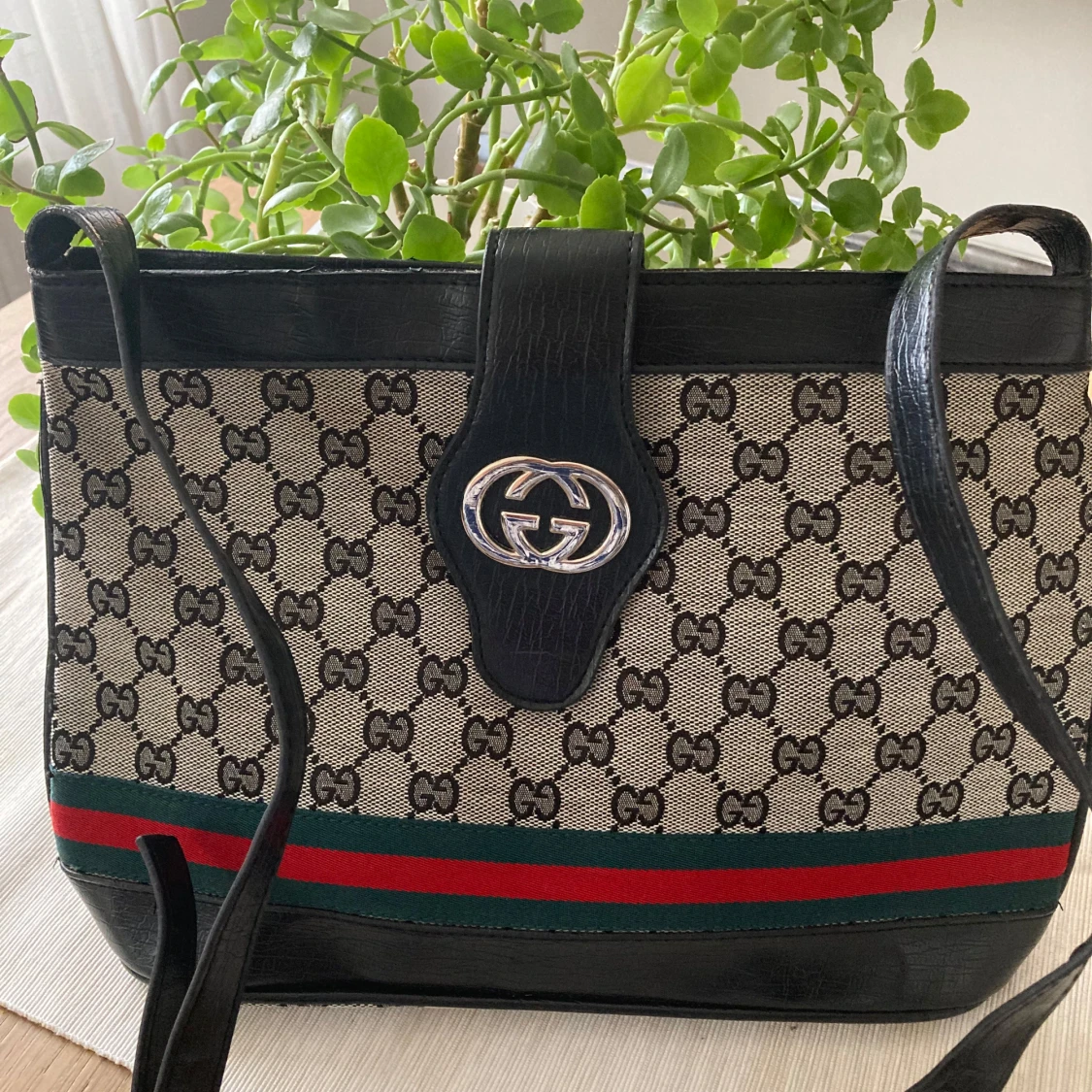 Snygg axelväska från Gucci med det klassiska GG-mönstret. Väskan har svarta skinnremmar och detaljer, samt en ikonisk logotyp framtill. Den har en dragkedja upptill och ett rymligt inre med extra fack. Perfekt för att ge din outfit en lyxig touch.