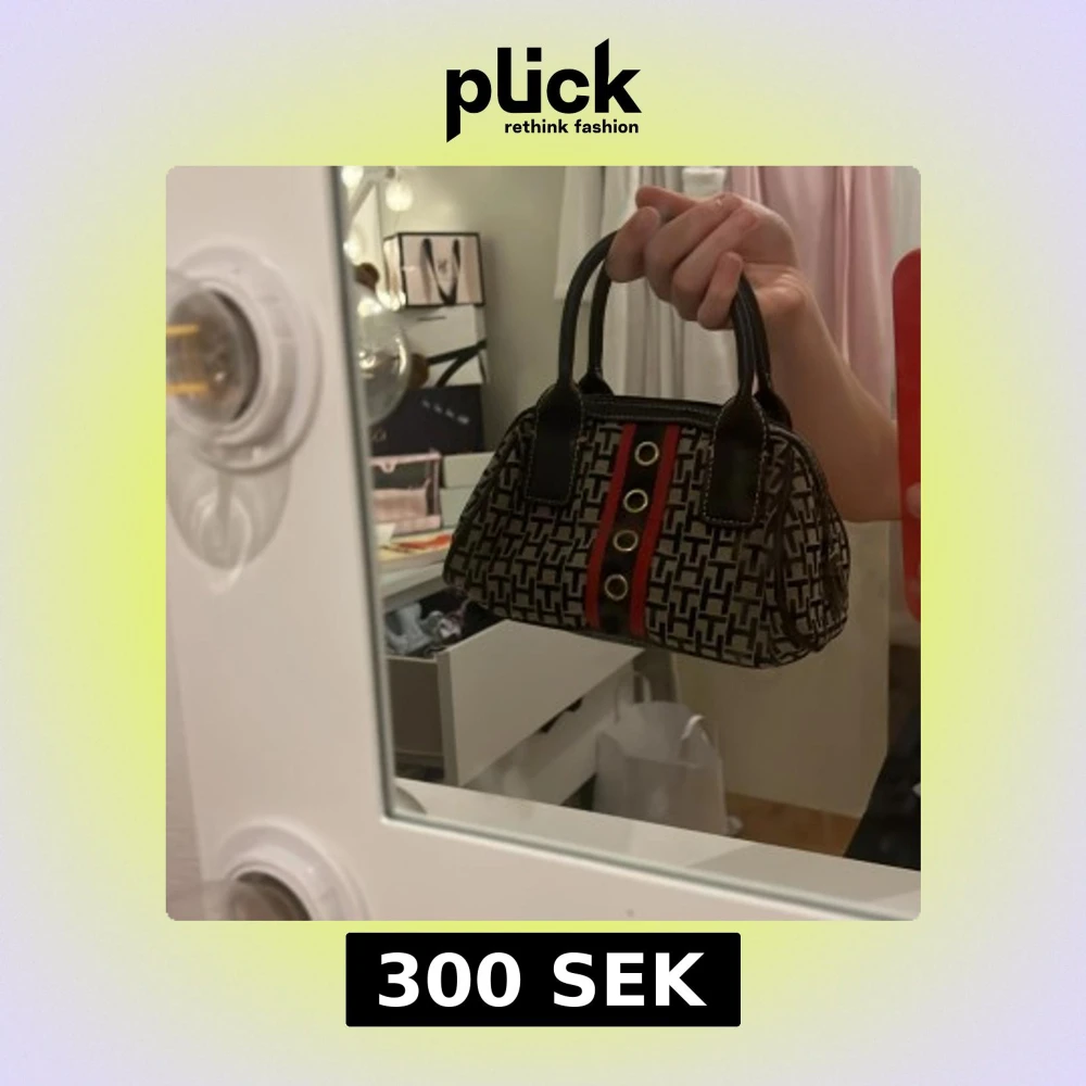 Säljer en snygg handväska från Tommy Hilfiger med svart och beige mönster, svarta handtag och detaljer i rött och grönt med guldfärgade knappar. Väskan har dragkedja och är perfekt för dig som vill ha en stilren accessoar.