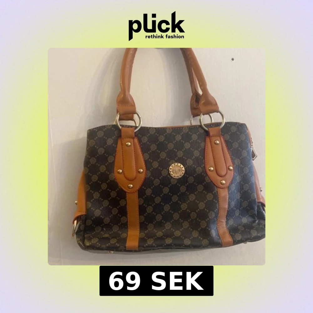 Snygg handväska med ett klassiskt mönster i mörka toner och bruna detaljer. Väskan har två robusta handtag och en praktisk dragkedja upptill. Perfekt för att bära dina dagliga nödvändigheter med stil.