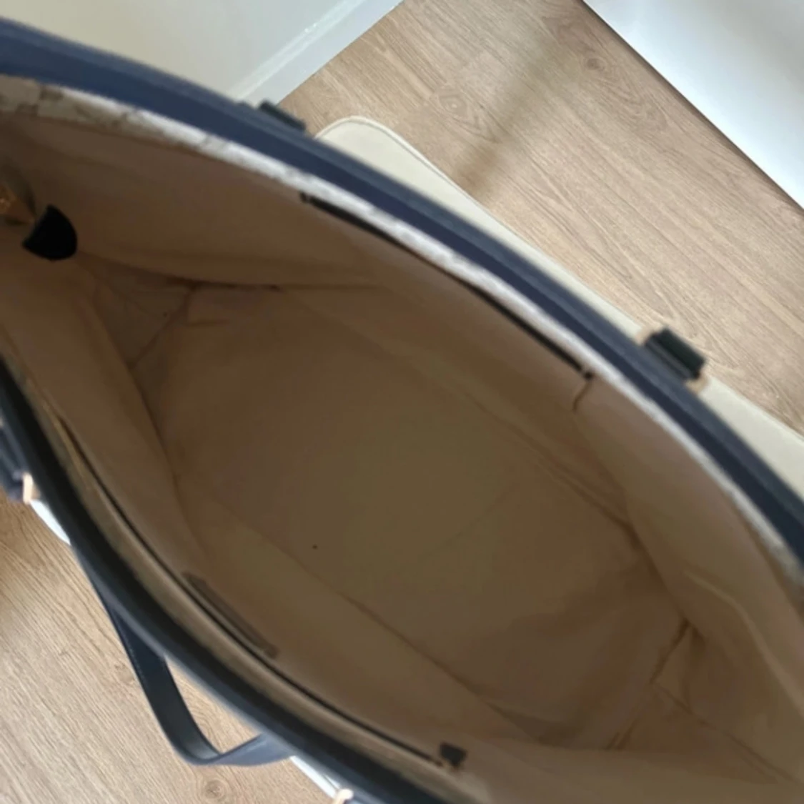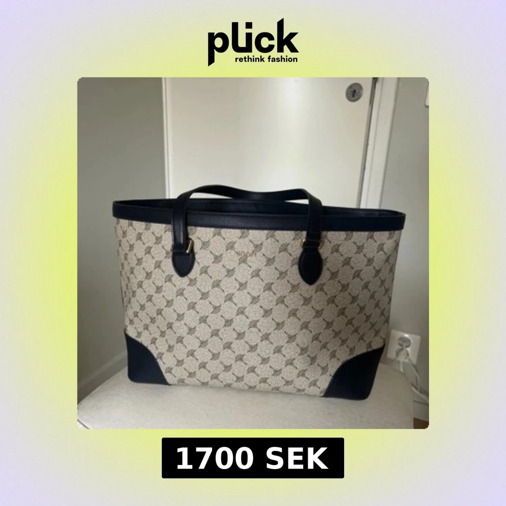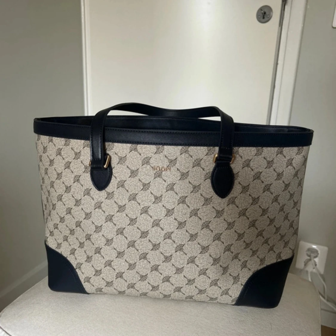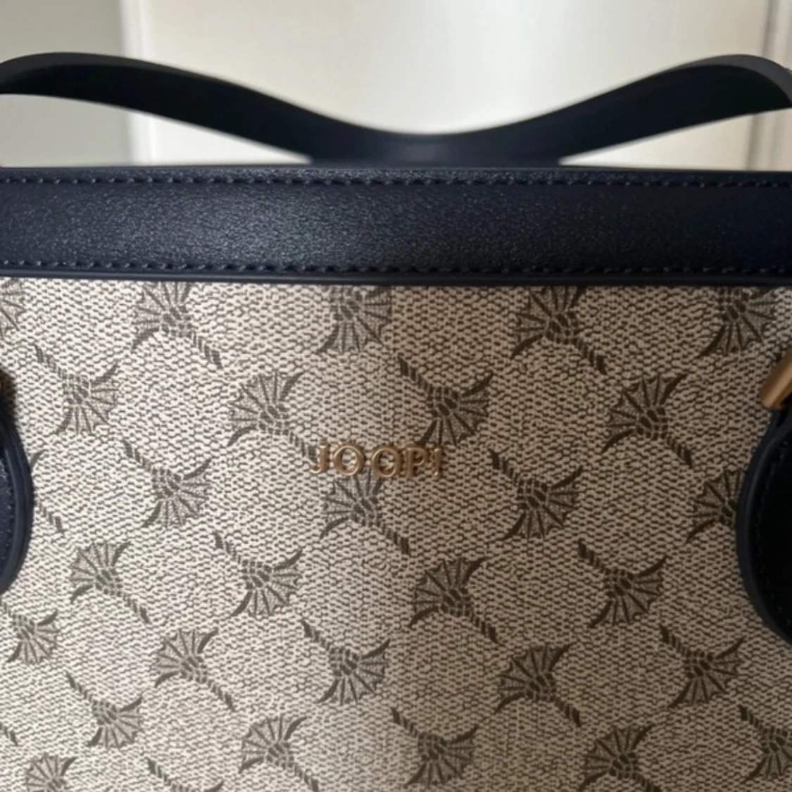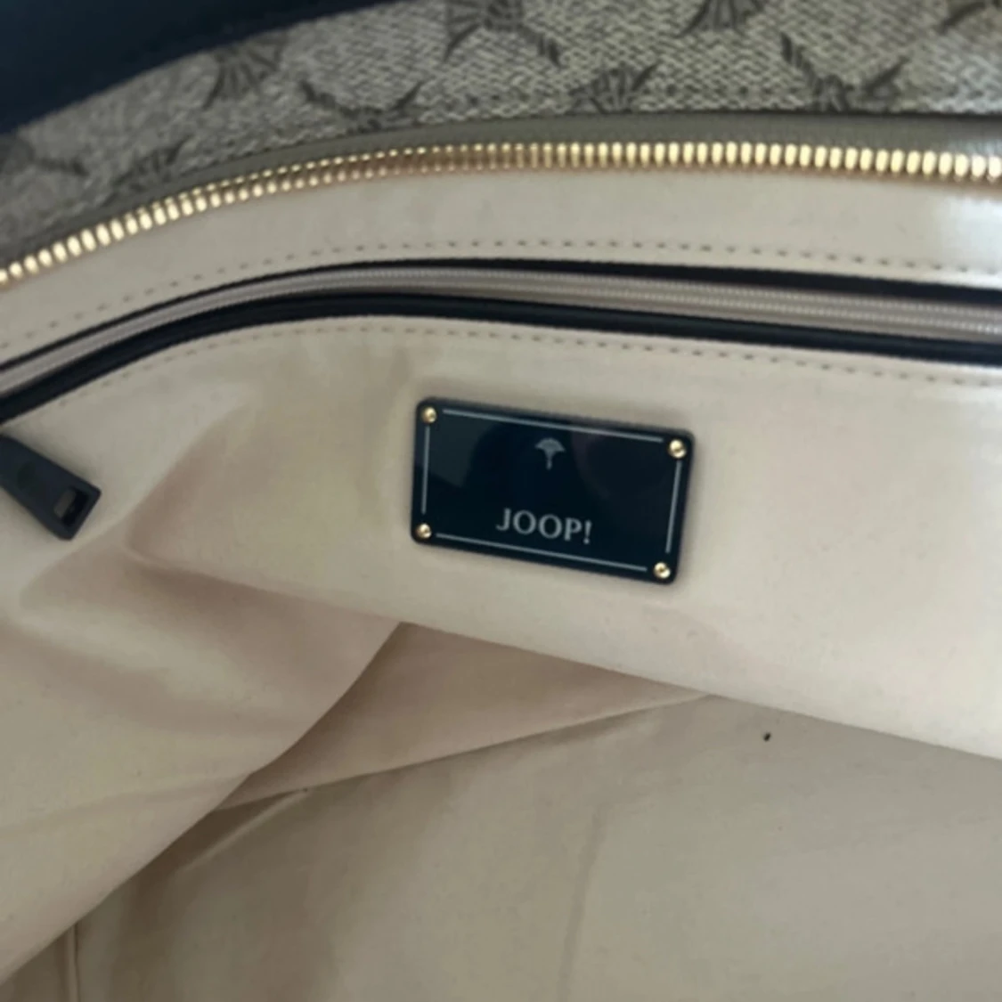 Snygg shoppingväska från Joop! med ett elegant mönster i beige och svart. Väskan har svarta handtag och detaljer, vilket ger en stilren look. Perfekt för att bära med sig allt man behöver under dagen.