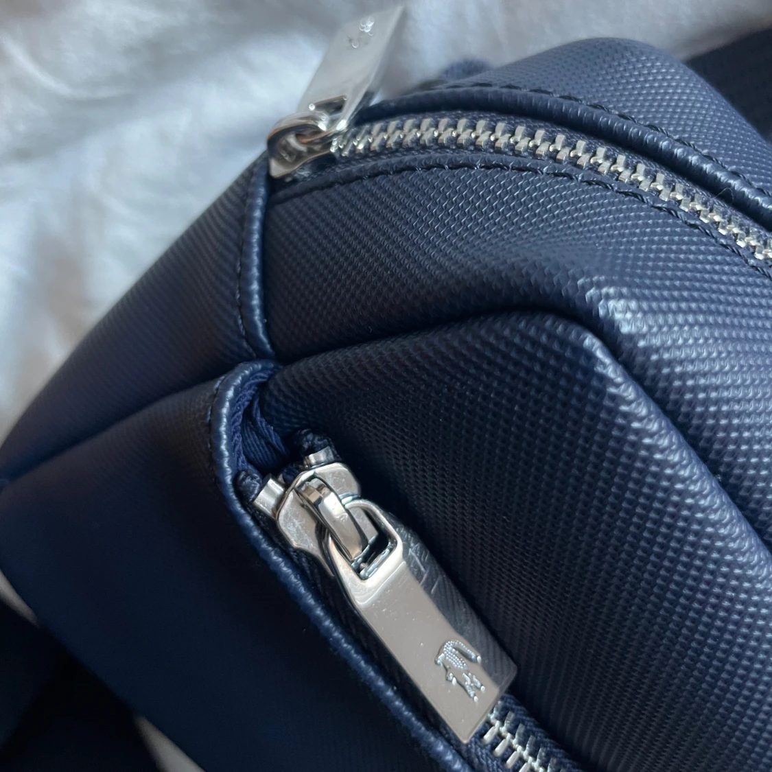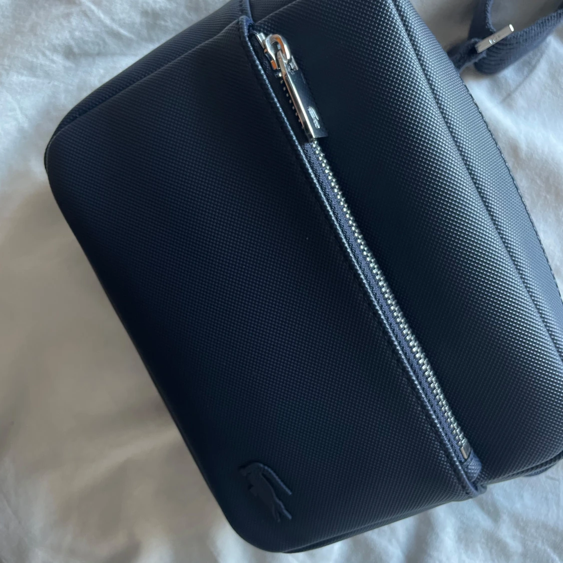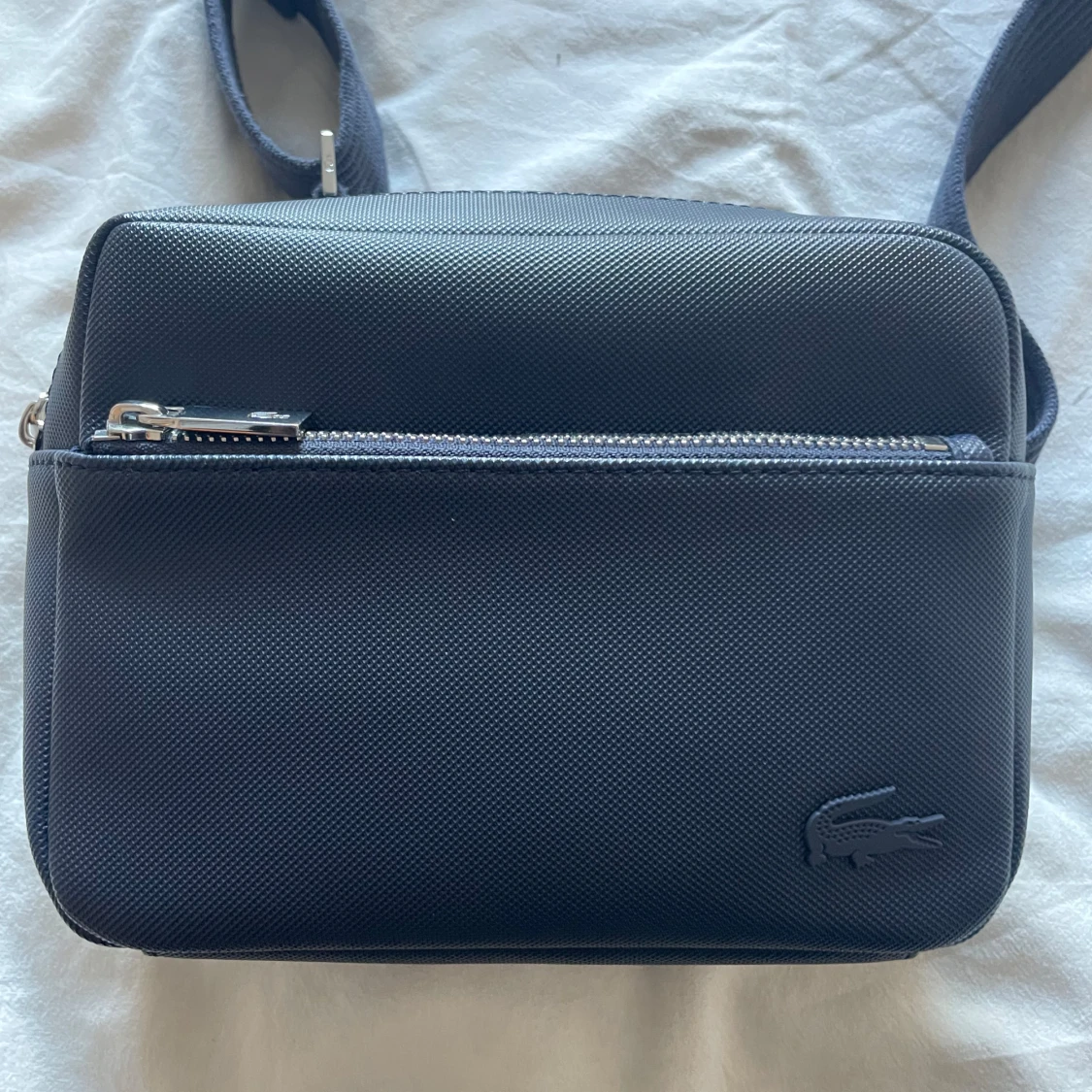 Snygg mörkblå axelväska från Lacoste med strukturmönstrad yta och silverfärgade dragkedjor. Väskan har ett diskret Lacoste-logotyp framtill och justerbar axelrem. Perfekt för att bära det viktigaste med stil.🙌🏾Lägg gärna egna prisförslag!! Säljer då min bror inte använder den, precis som ny🤩‼️