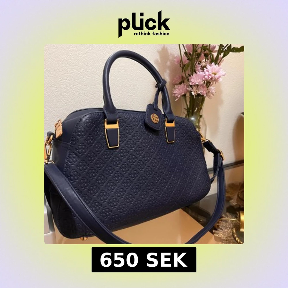 Snygg mörkblå handväska från Tory Burch i präglat skinn med guldiga metalldetaljer. Väskan har både handtag och avtagbar axelrem, samt dragkedja upptill. Klassisk form med diskret mönster och logga framtill. Perfekt för dig som gillar stilrena accessoarer.