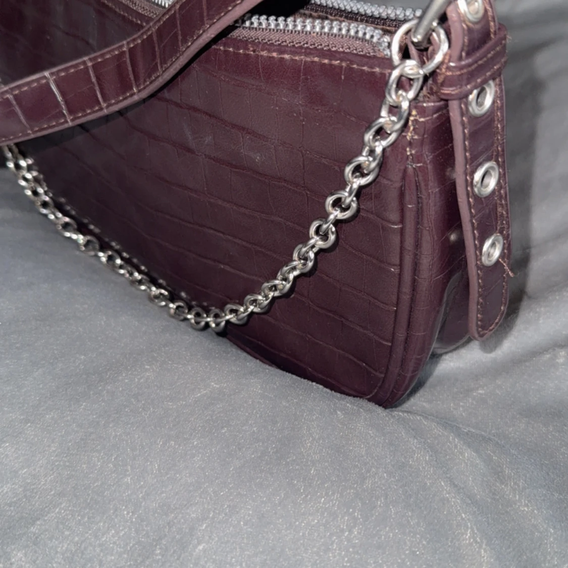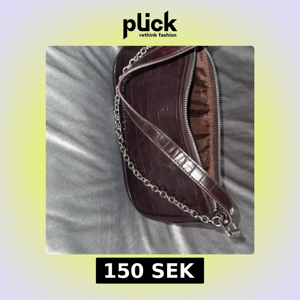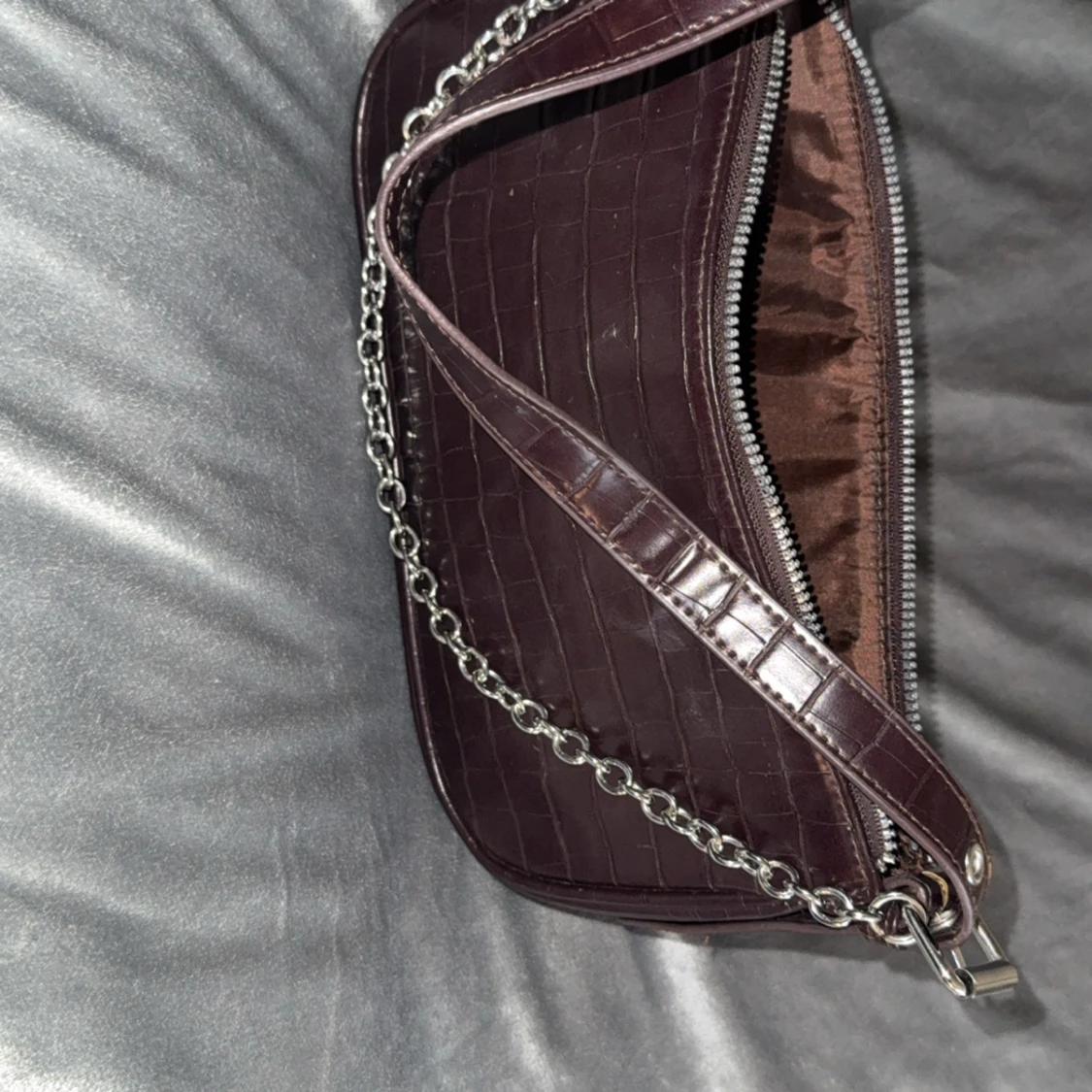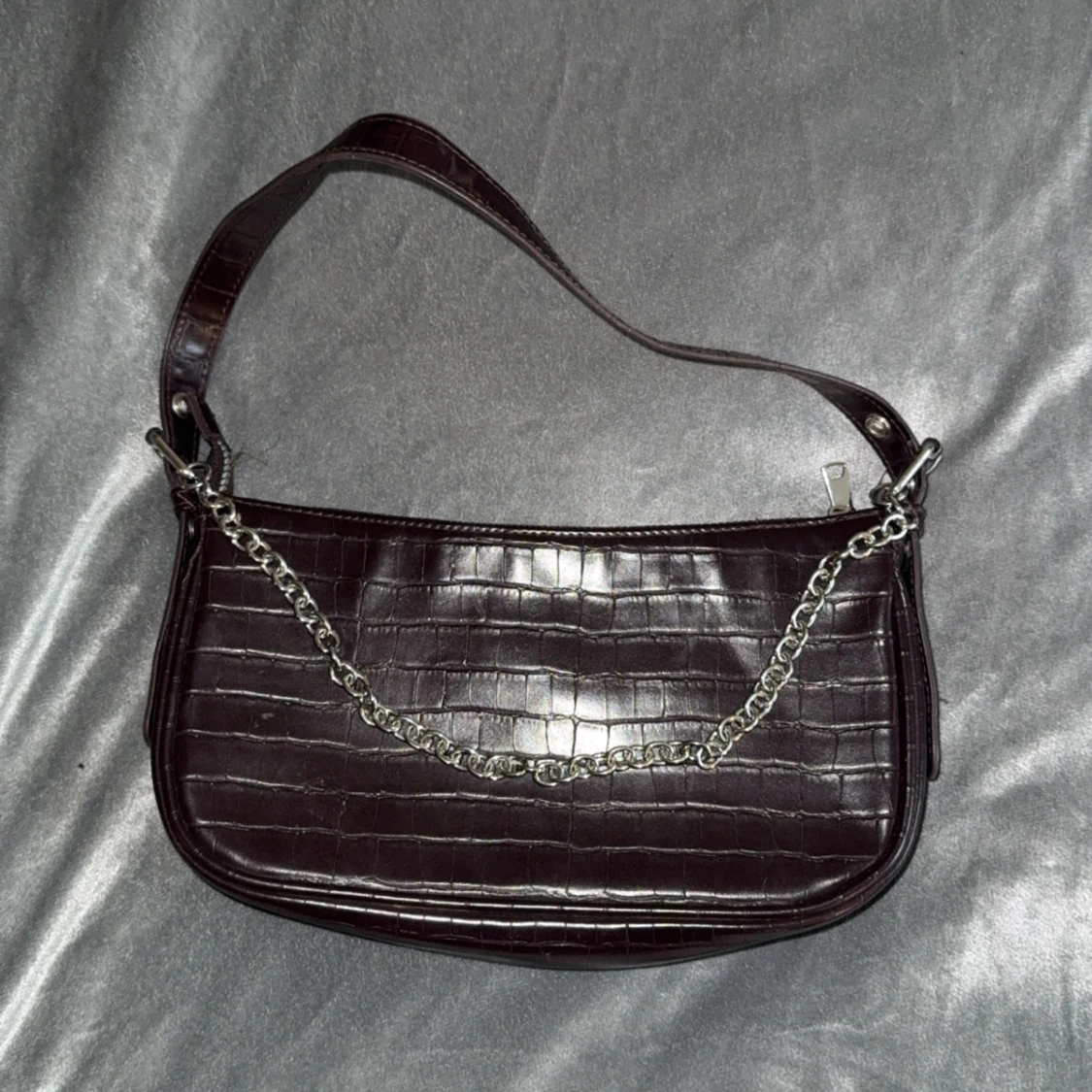 Snygg mörkbrun axelväska i croco-mönstrat skinnimitation med silvrig kedja framtill. Väskan har dragkedja upptill och justerbart axelband med metallringar. Perfekt storlek för det viktigaste och ger en trendig vibe till din outfit. De går att ta bort silver kedjan på väskan.