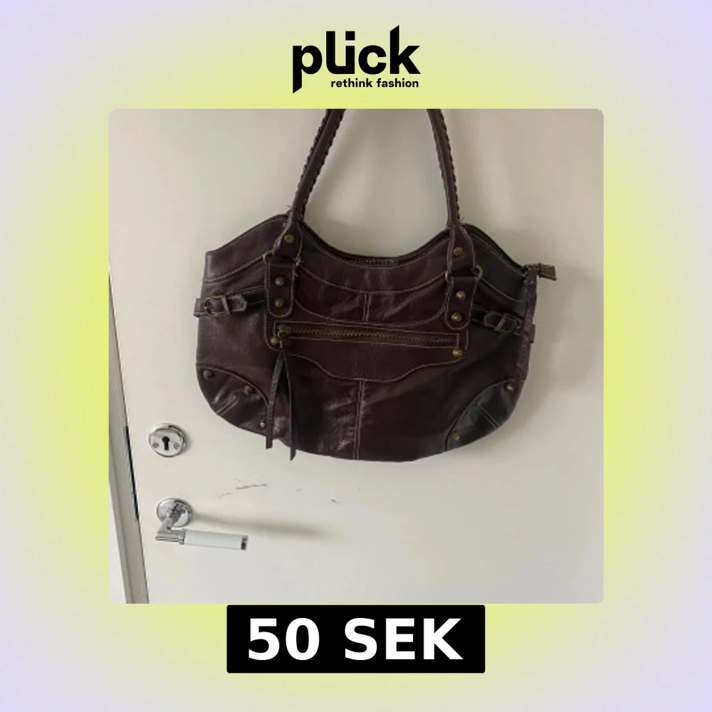 Säljer en mörkbrun handväska i skinn med dekorativa nitar och dragkedja framtill. Väskan har dubbla handtag och detaljerade sömmar. Perfekt för dig som vill ha en rymlig och stilren accessoar.