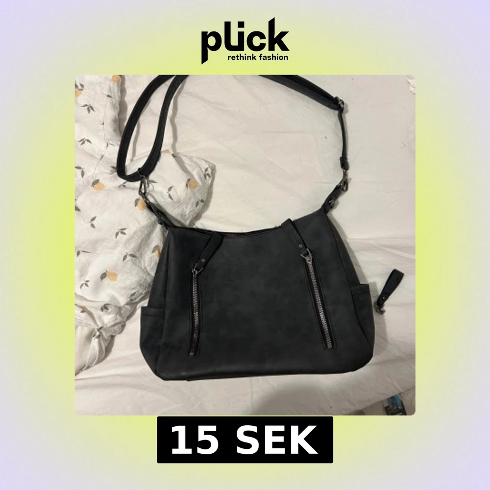 Säljer en mörkgrå axelväska i syntetmaterial med två snygga dragkedjor framtill och en extra ficka med dragkedja på baksidan. Väskan har justerbar axelrem och flera fack för att hålla ordning på dina grejer. Kedjan där uppe krångla som man kan se så klippt bort den men själva den man stänger med är kvar så de matchar, det går ju att sy en ny dragkedja - jag kan göra det åt dig innan jag skickar men då kostar den extra (samma pris som kjendjan kosta)💕