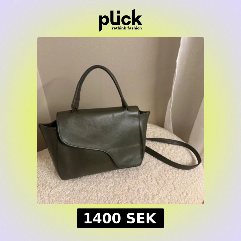 Snygg mörkgrön handväska med stilren design och asymmetrisk lock. Väskan har både handtag och axelrem, samt guldfärgade metalldetaljer. Tillverkad i slätt skinn och passar perfekt för dig som gillar minimalistisk stil. Använt skick men mycket kvar att ge