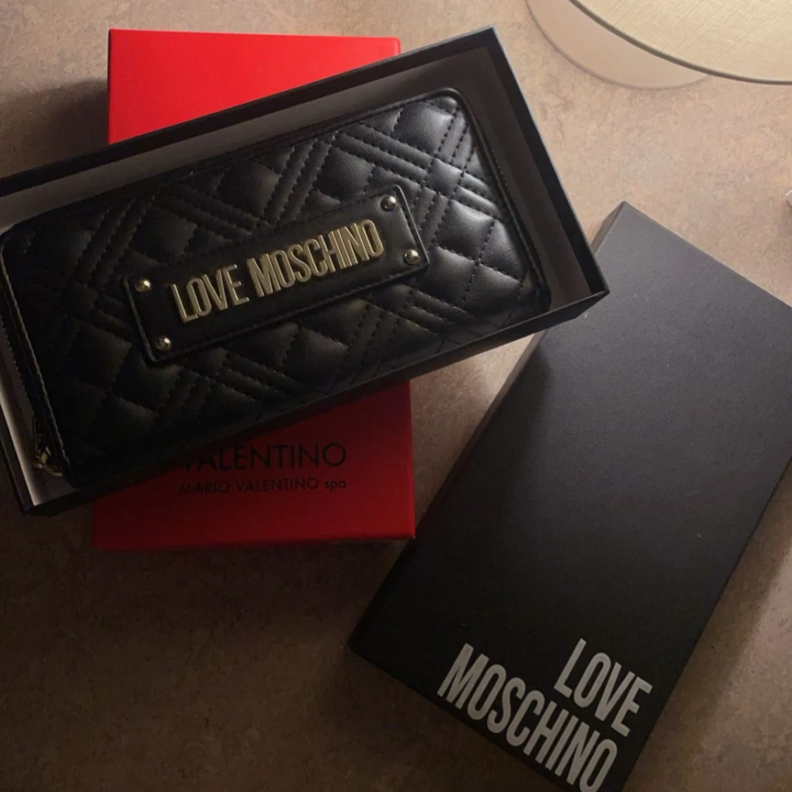 Snygg svart quiltad plånbok från Love Moschino med dragkedja och en elegant logotypplatta i metall. Perfekt för att hålla dina kort och kontanter organiserade med stil.boxen och dustbagen ingår