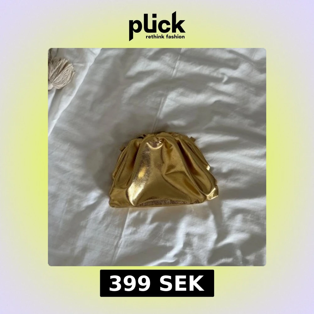 Cool kuvertväska i metallicguld med mjuk, puffig form. Väskan har en trendig design med rynkade detaljer upptill och är perfekt för att sticka ut. Materialet är glansigt och känns lyxigt. Perfekt accessoar för att lyfta din outfit. Den är ifrån NA-KD och är endast använd 1 gång. Så den är helt som ny!