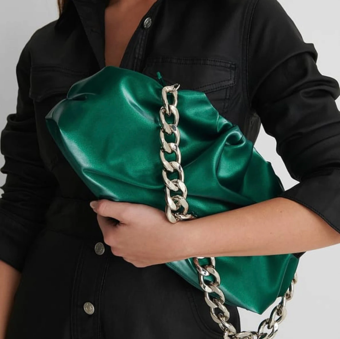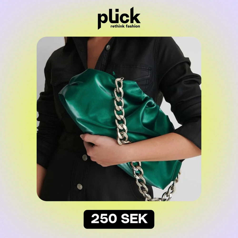 Säljer min grön metallic väska från nakd, den har en kedja och ett tunt band som tillhör väskan.