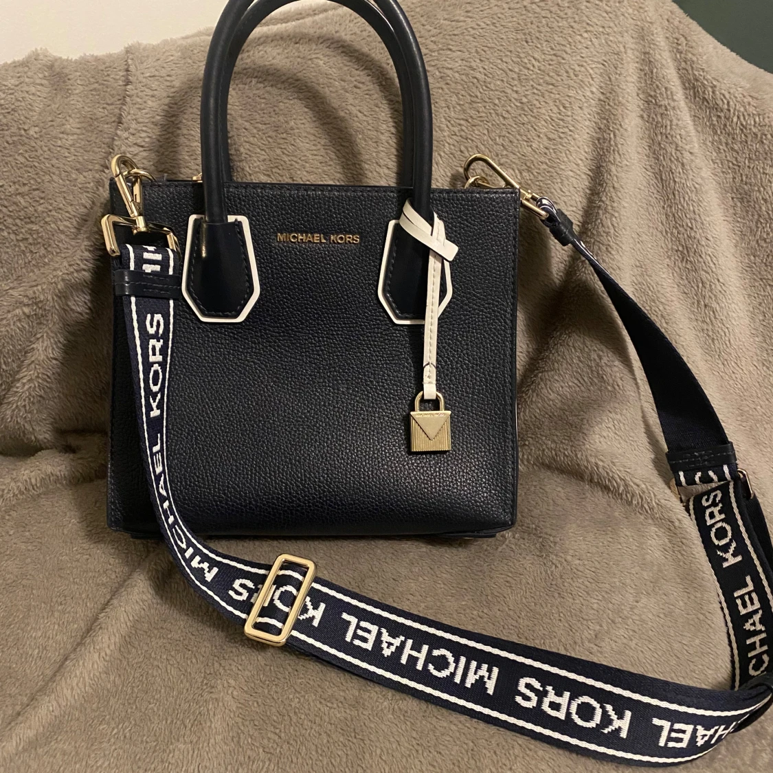 Snygg navy handväska från Michael Kors i skinn. Väskan har en justerbar axelrem med logotyp och guldfärgade detaljer. Perfekt för både vardag och fest! Pris kan diskutera.