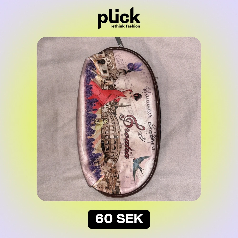 Necessär med ett färgglatt tryck av en kvinna i röd klänning och kroatiskt motiv. Dragkedja upptill för säker förvaring.
