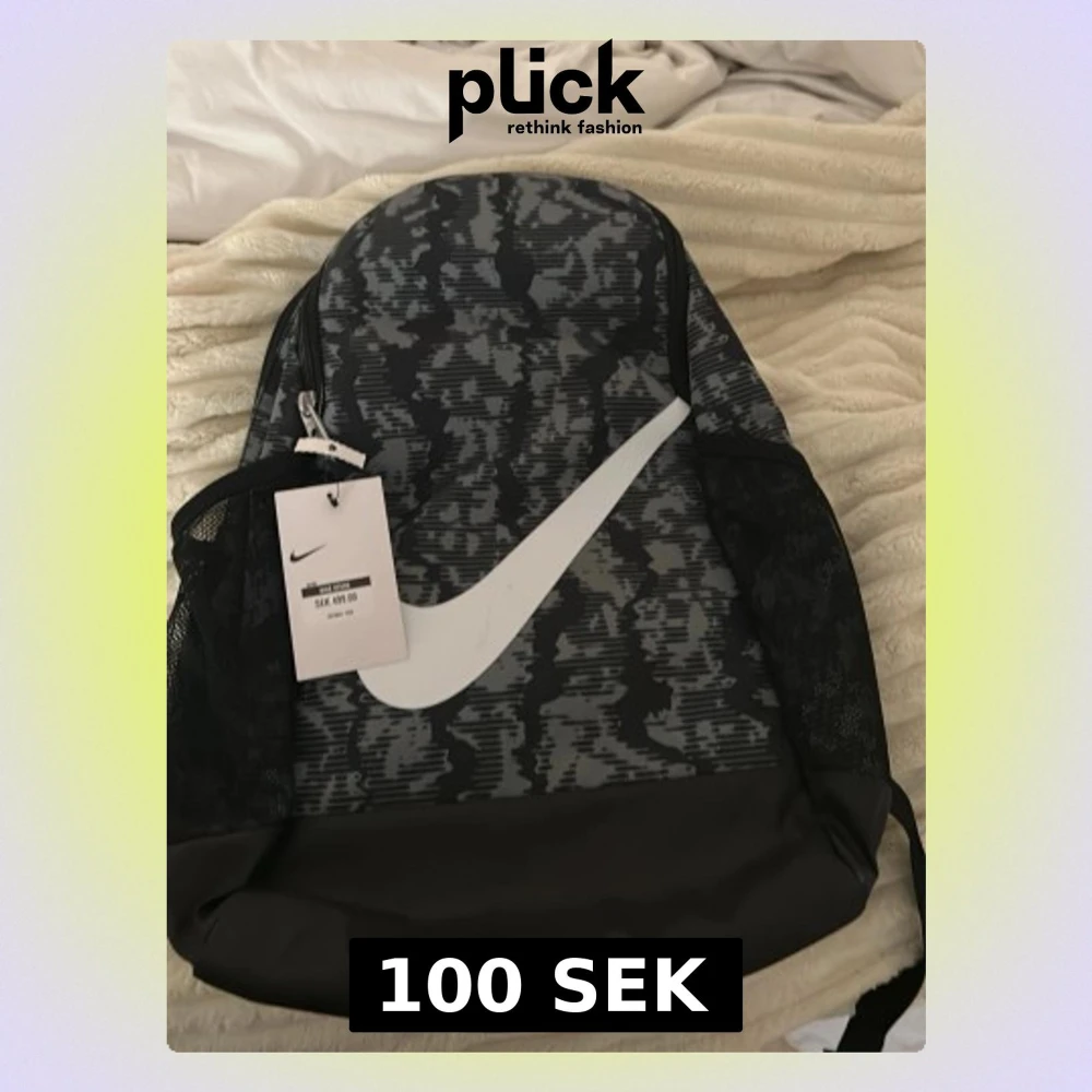Säljer en snygg ryggsäck från Nike med svart och grått kamouflagemönster och stor vit logga på framsidan. Väskan har meshfickor på sidorna och dragkedja upptill. Perfekt för dig som vill ha en cool och praktisk väska till skolan eller träningen.