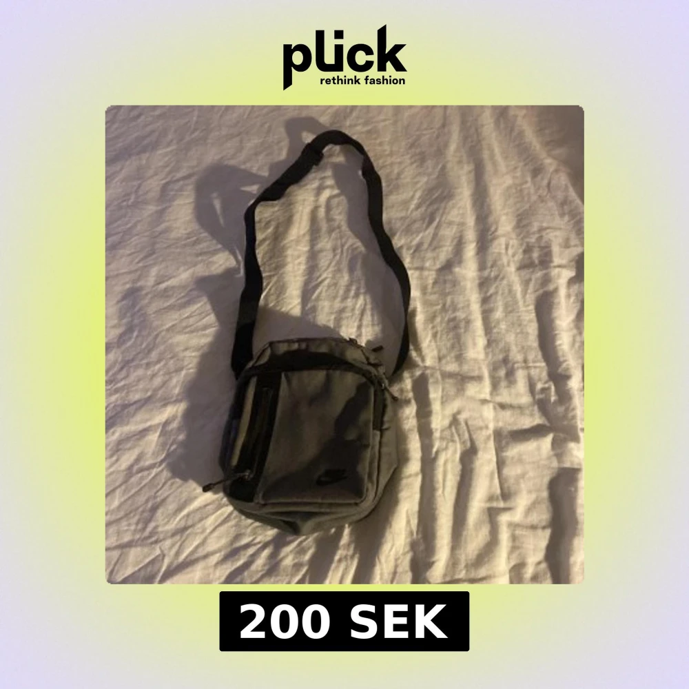 Snygg och praktisk grå axelväska från Nike med justerbar rem. Väskan har flera fack med dragkedja för enkel organisering och en stilren design med Nike-logga på framsidan.