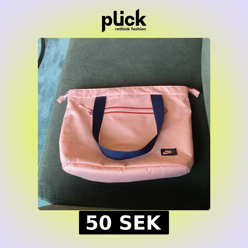 Säljer en ljusrosa axelväska från Nike med marinblåa handtag och en rödvit dragkedja framtill. Väskan har en enkel, sportig design och är perfekt för att bära med sig det viktigaste. Nike-loggan sitter på en blå lapp i nedre hörnet.