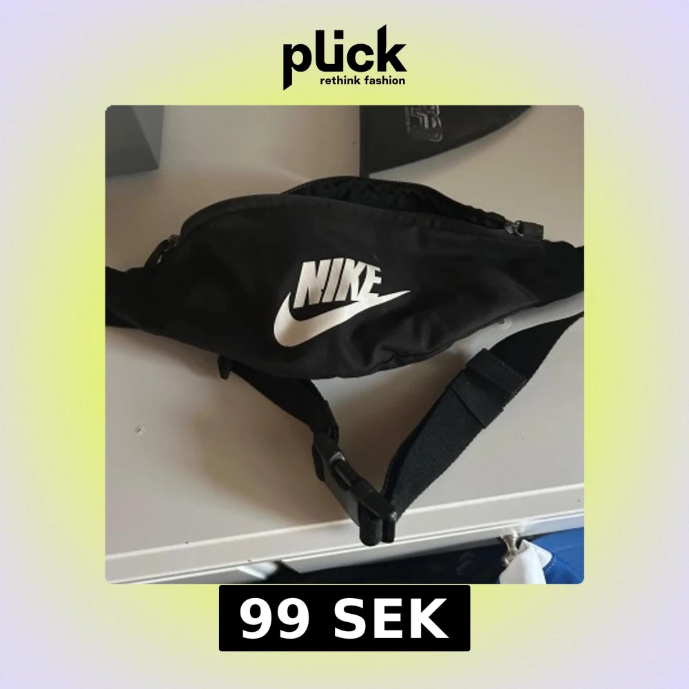 Säljer en svart magväska från Nike med klassisk vit logga framtill. Väskan har justerbart band och smidig dragkedja upptill. Perfekt för att bära mobilen, plånboken och andra smågrejer när du är på språng.