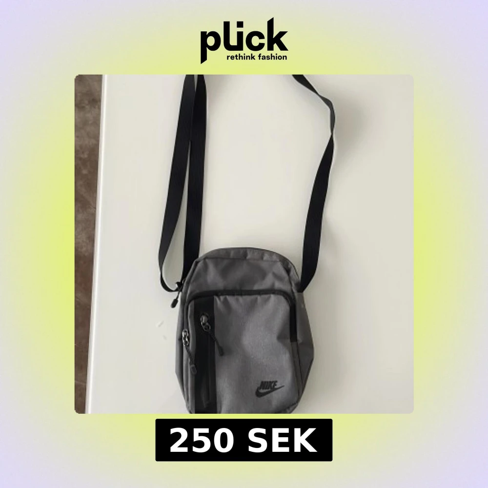 Snygg grå axelväska från Nike med svart logga framtill. Väskan har justerbar svart rem, två dragkedjefack på framsidan och ett extra fack på baksidan. Perfekt storlek för mobil, plånbok och andra småprylar. Tillverkad i slitstark polyester.
