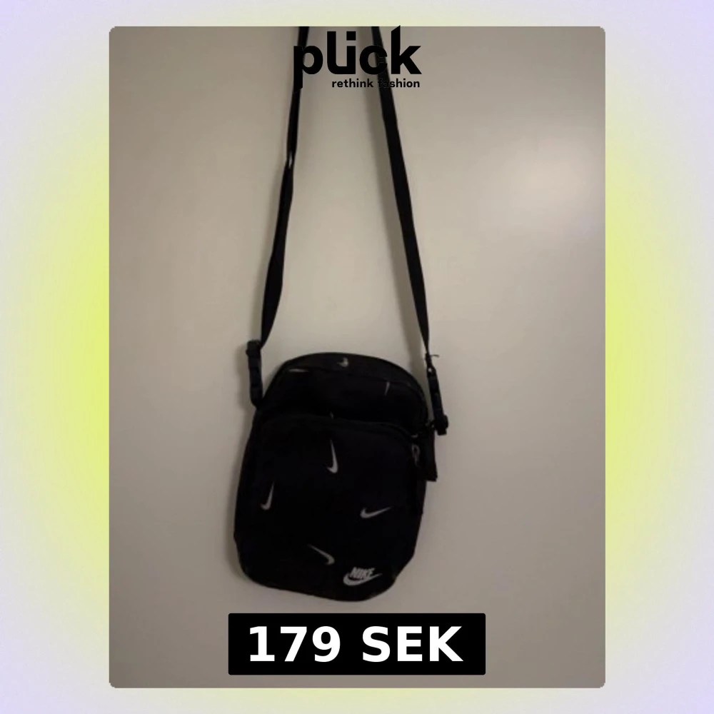 Den har använts och man ser därför priset Snygg svart axelväska från Nike med justerbar rem och flera vita swoosh-loggor över hela väskan. Väskan har dragkedja och är perfekt för att bära det viktigaste. Tillverkad i slitstarkt syntetmaterial och har en clean, sportig look.