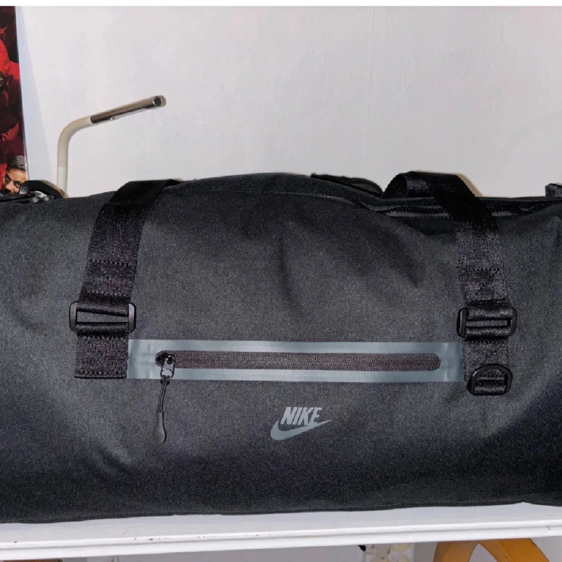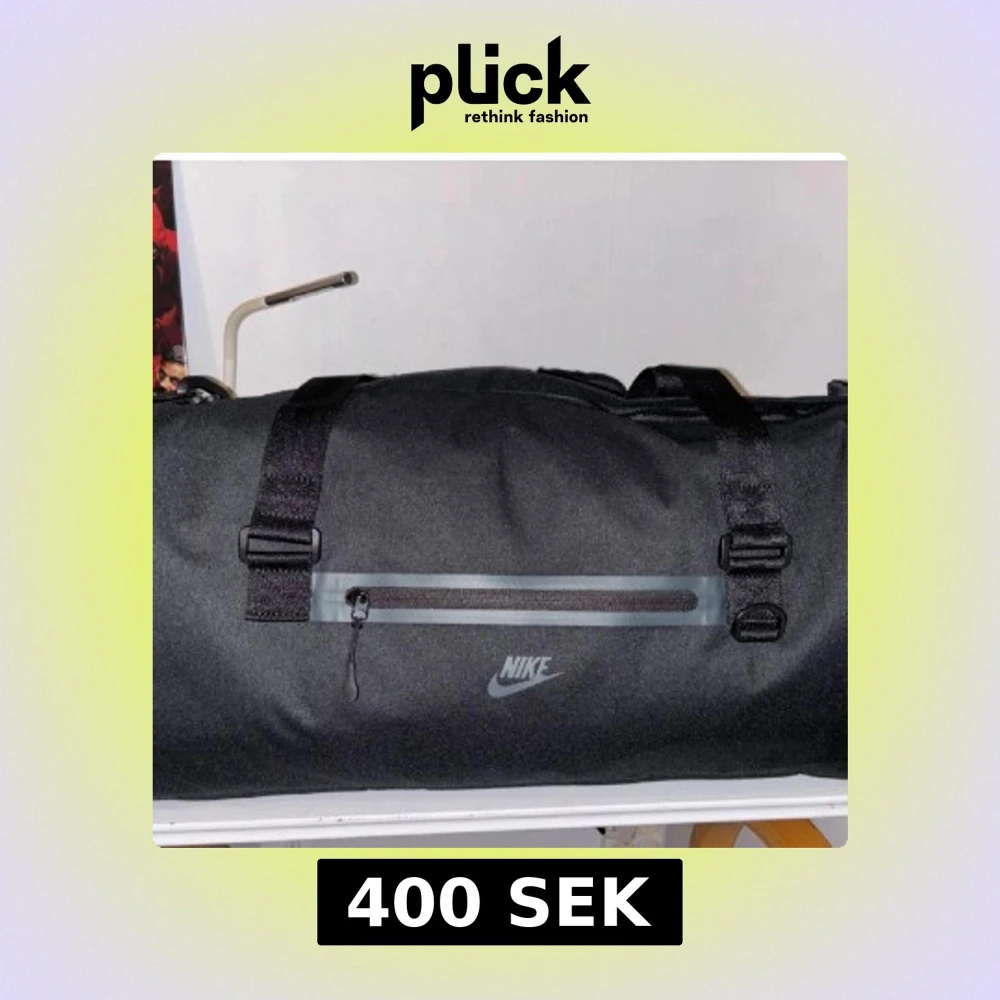 Säljer en svart träningsväska från Nike med stilren design och praktisk dragkedja framtill. Väskan har justerbara remmar och är perfekt för gymmet eller sportaktiviteter. Nike-loggan syns tydligt på framsidan och materialet är slitstarkt syntet.