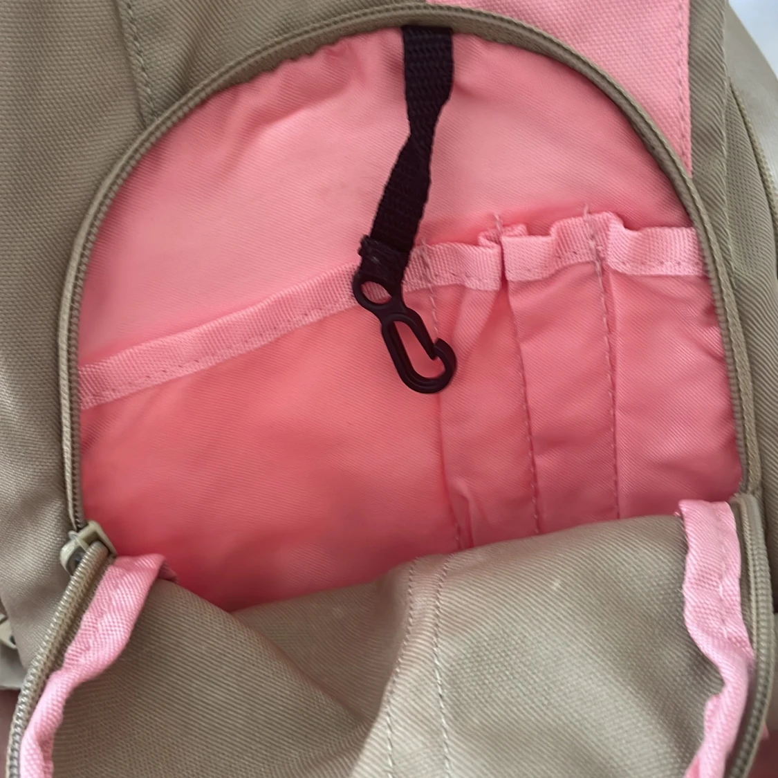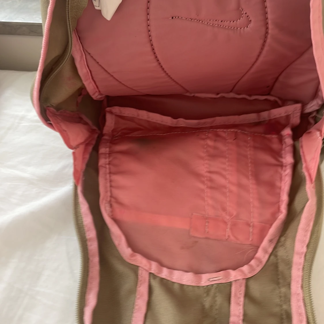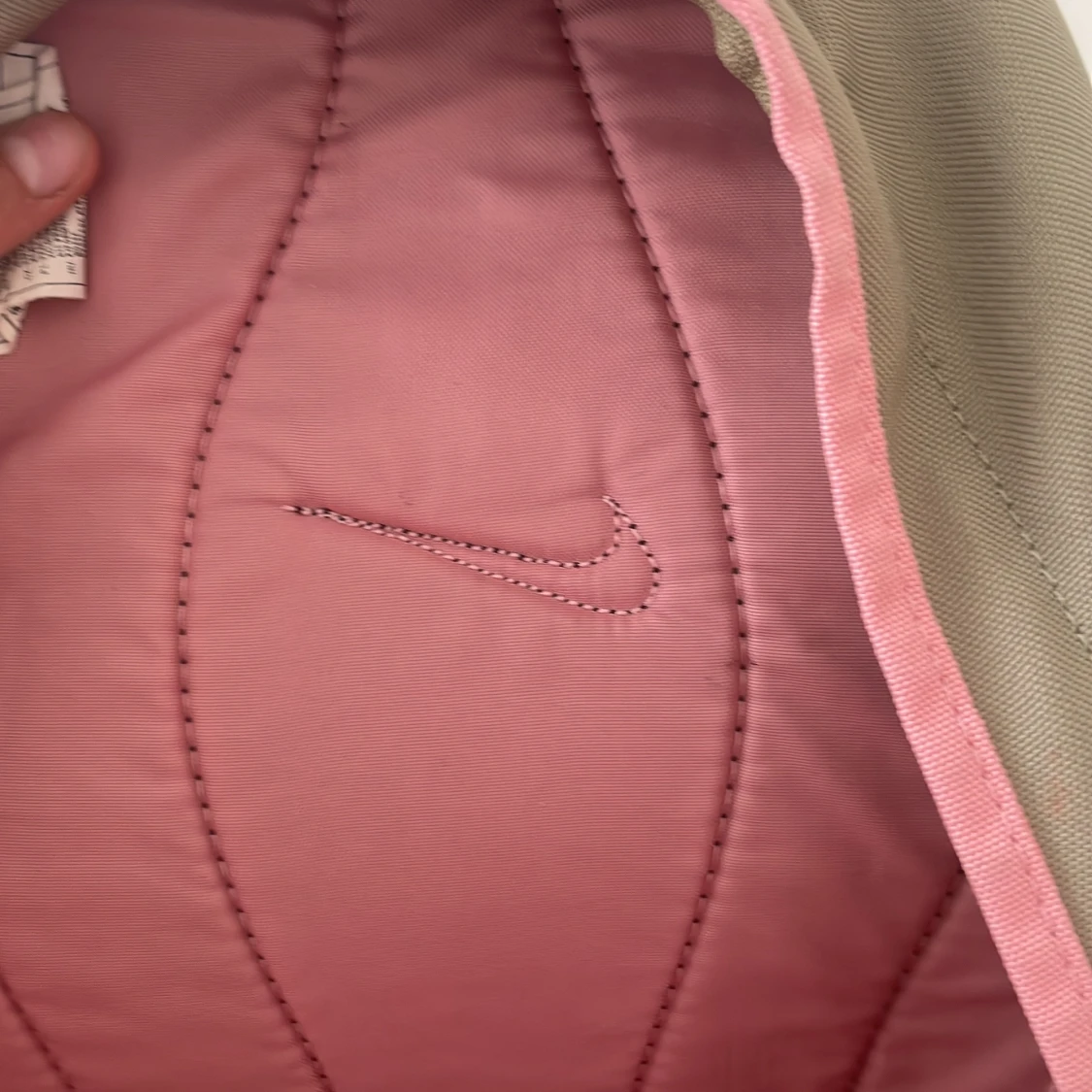Snygg ryggsäck från Nike i beige med rosa detaljer och röd logga framtill. Väskan har flera fack med dragkedja, vadderade axelband och rosa innerfoder med broderad Nike-logga. Perfekt för skolan eller träning, rymmer allt du behöver.