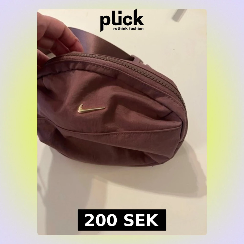 Säljer en brun axelväska från Nike med justerbart band och dragkedja. Väskan har ett stilrent guldigt Nike-märke på framsidan och ett rymligt fack med meshficka på insidan. Perfekt för att bära med sig det viktigaste och hålla koll på grejerna.