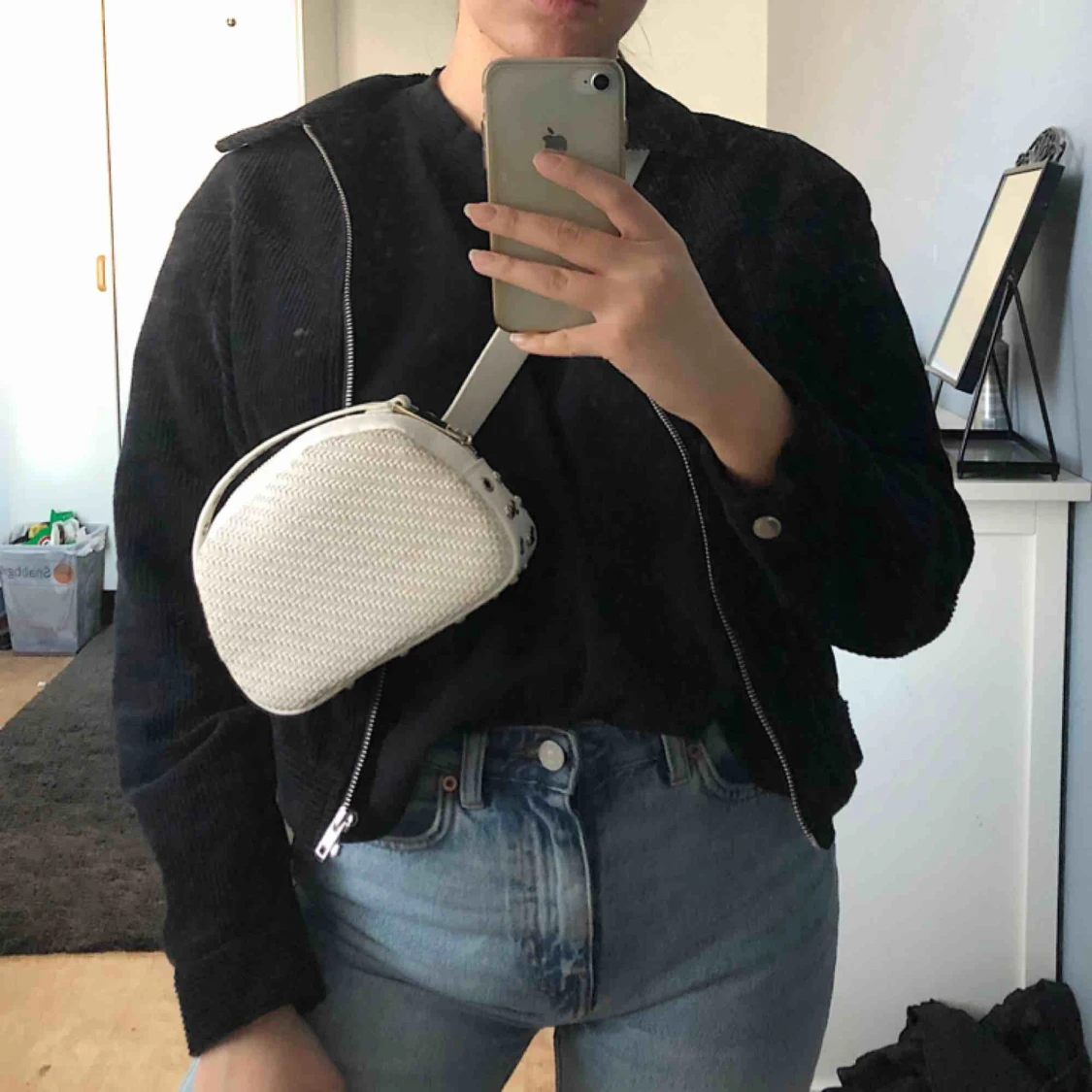 Superfin väska som man kan ha runt mage/axel som på bilderna men det medföljer även ett band så att man kan ha den som en vanlig axelremsväska. Vitare än den ser ut på bilderna! Perfekt nu till vår och sommar