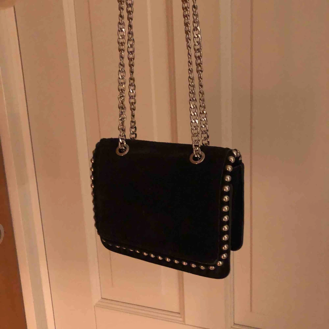 Mocka väska i mörkblå/svart. Den är liten med en lång kedja som man antingen kan ha över kroppen eller om man ”tar upp” kedjorna så det blir mer av en axelväska. Passar fint till vardag och fest. Bra kvalite, köpt för 600kr från början