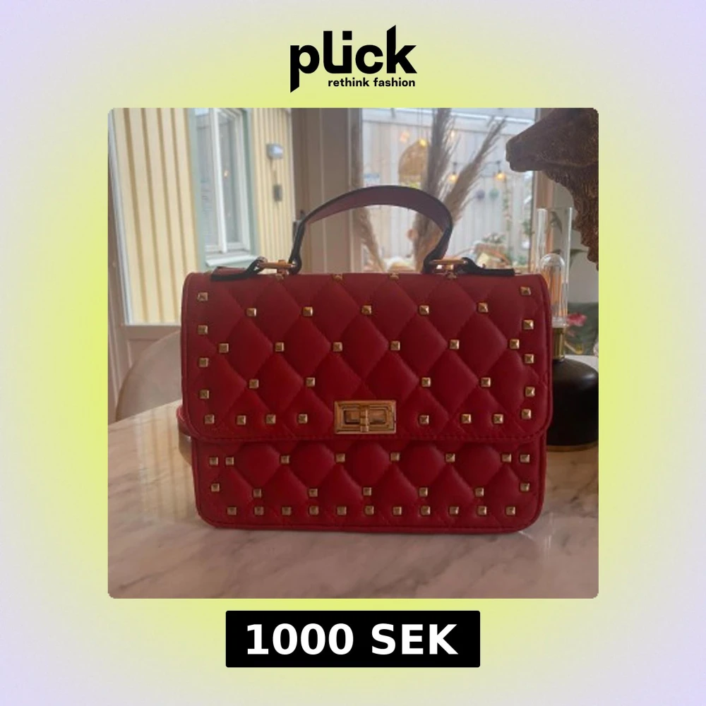 Röd nitväska köpt på plick. Det långa bandet går att ta av/på .