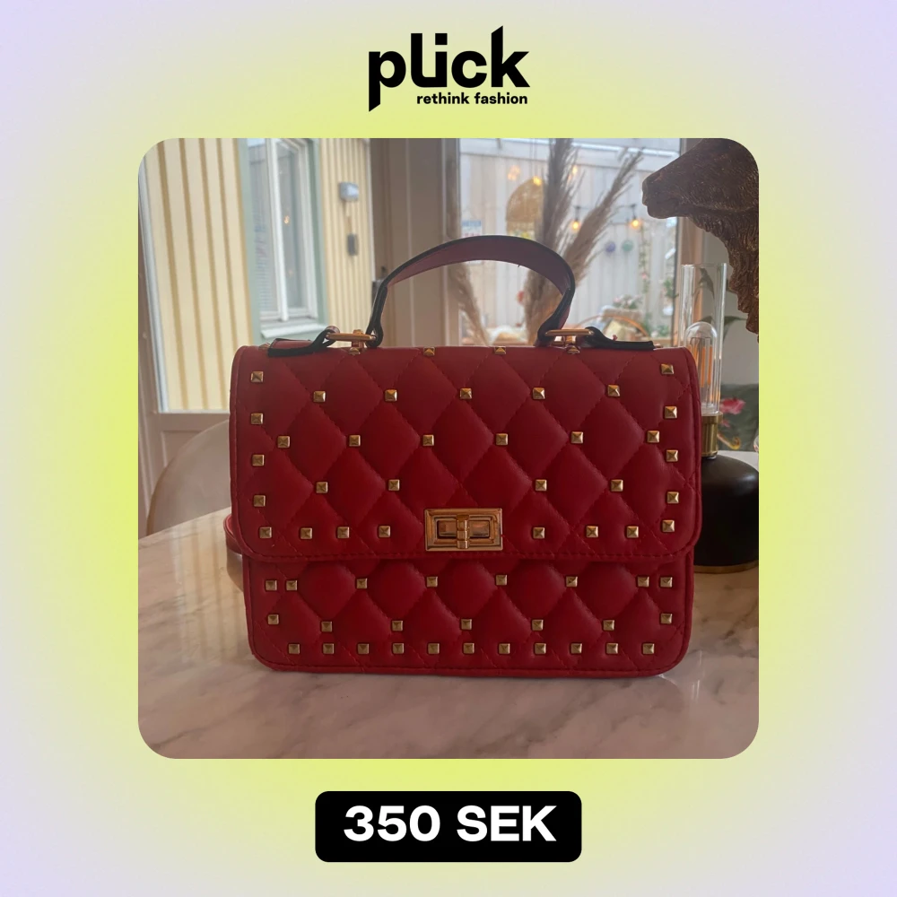 Röd nitväska köpt på plick. Det långa bandet går att ta av/på . Några jätte små defekter där lite tråd gått upp o knäppet lite repigt som man ser på bild 3& 4