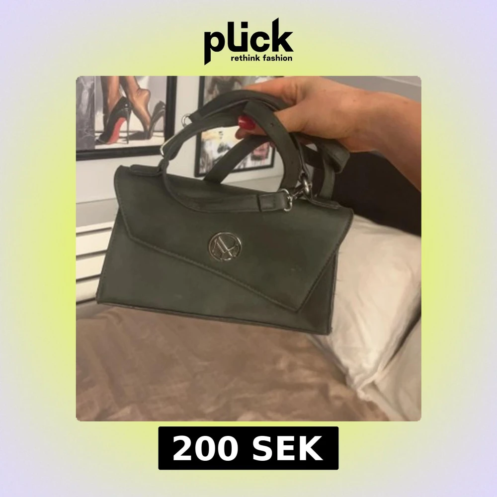 Snygg grön handväska med en stilren metallogo på framsidan. Väskan har ett lock med asymmetrisk design och ett bekvämt handtag.