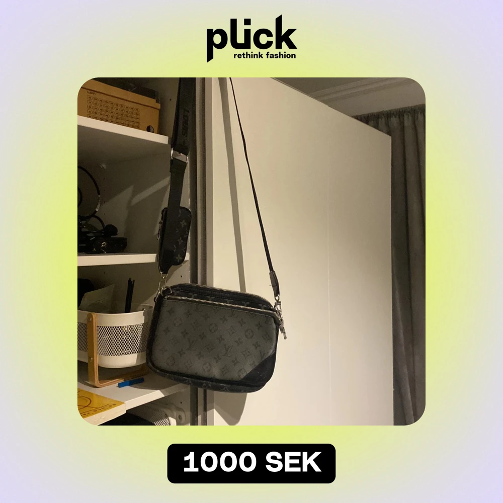 Snygg svart axelväska med monogrammönster. Väskan har en justerbar axelrem och dragkedja för säker förvaring. Perfekt för vardagsbruk eller en kväll ute. Den är i mycket bra skick och har en stilren design som passar till det mesta.