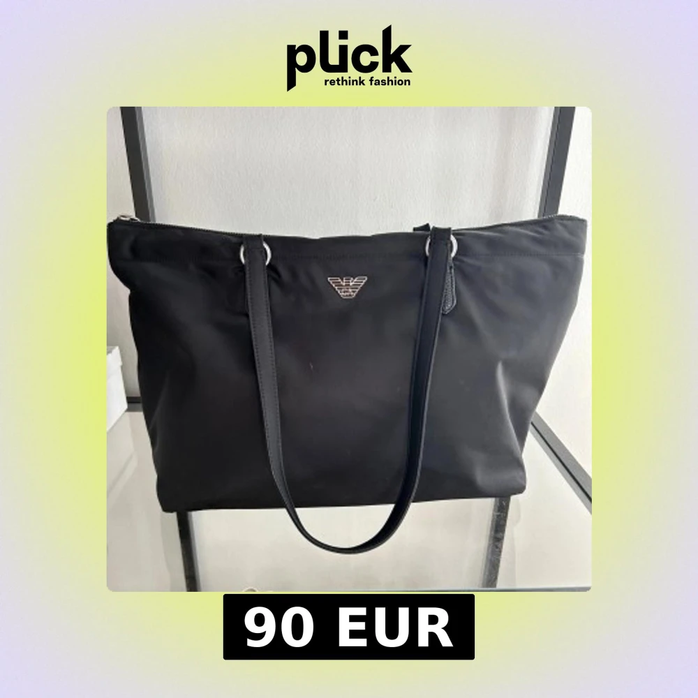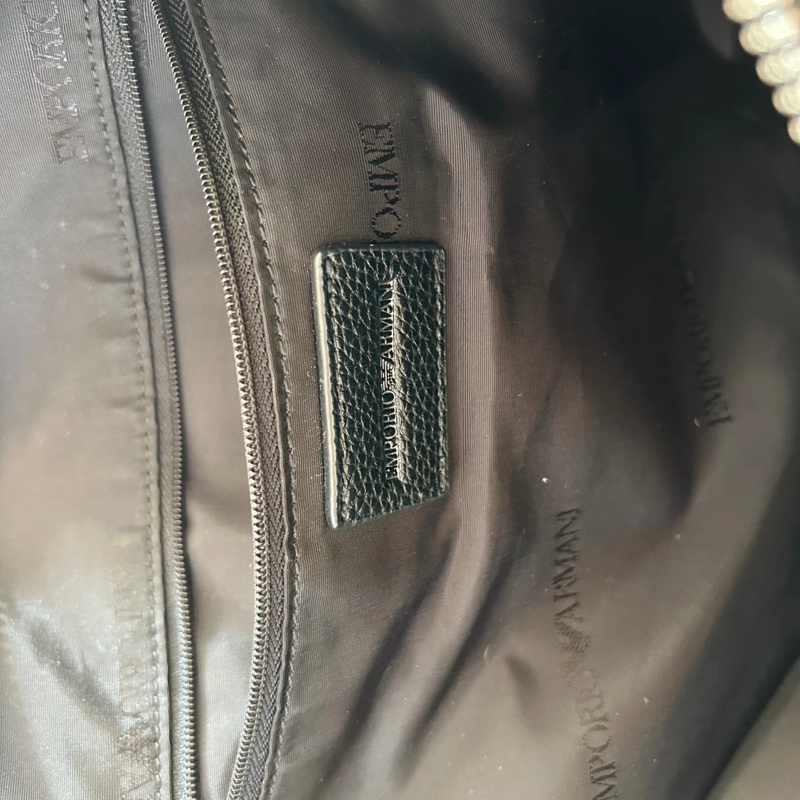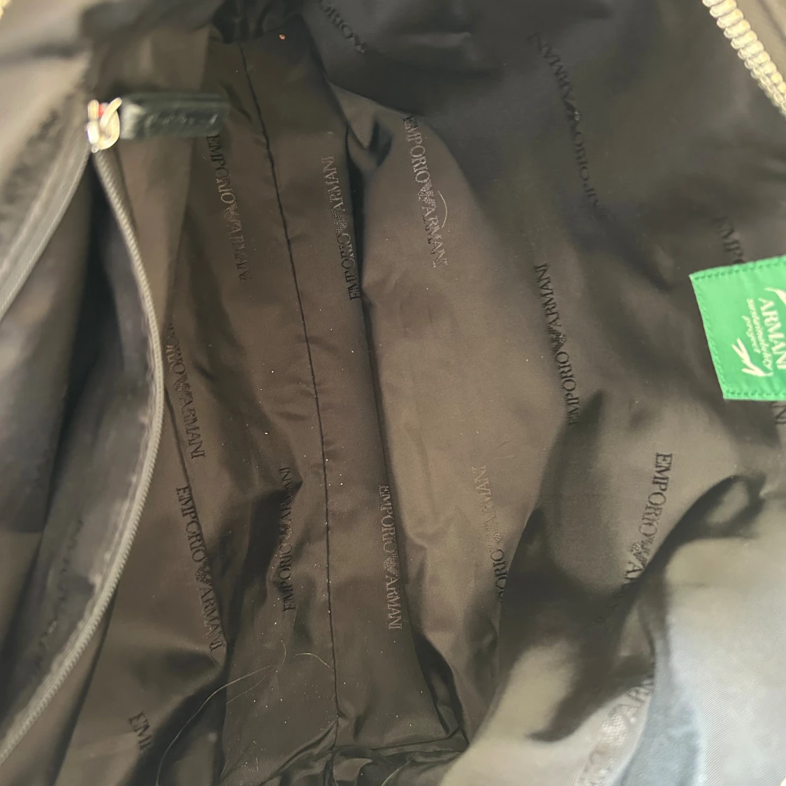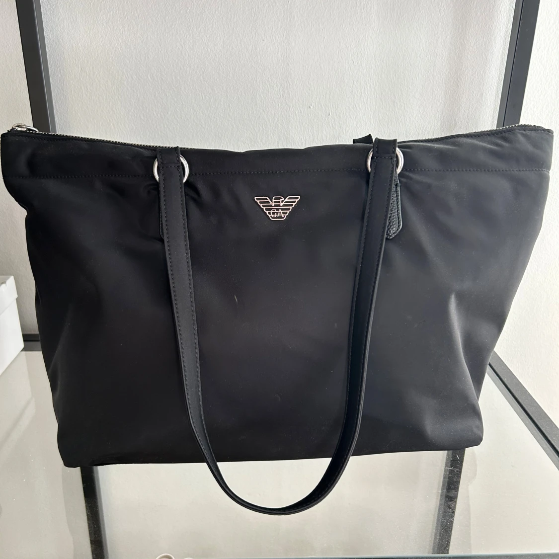 Stilren svart axelväska från Emporio Armani med silverfärgad logga framtill. Väskan har långa axelband och är tillverkad i ett slätt syntetmaterial. Invändigt finns ett rymligt fack med dragkedja och diskret mönstrat foder med märkets logga.