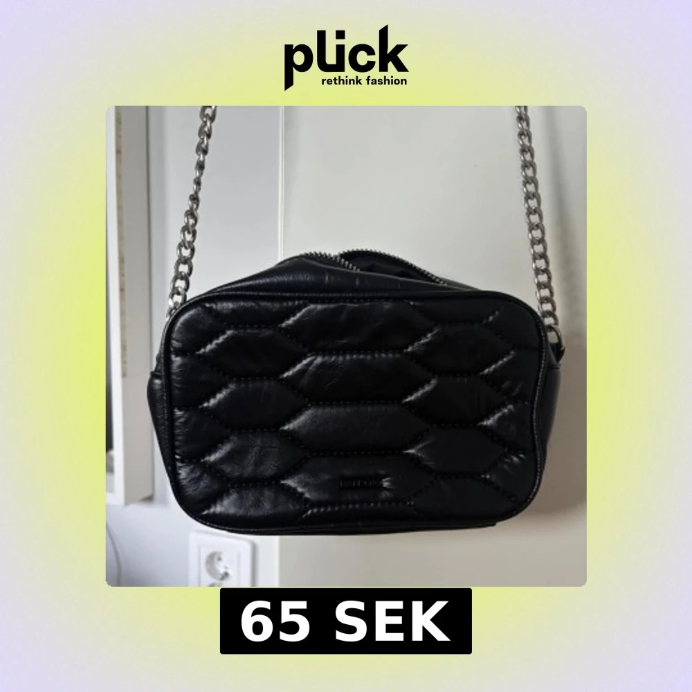 Snygg svart axelväska från Parfois i quiltat skinnimitation. Väskan har silverfärgad kedja och justerbart axelband i läderlook. Perfekt storlek för mobil och småsaker, med dragkedja upptill och stilren design.