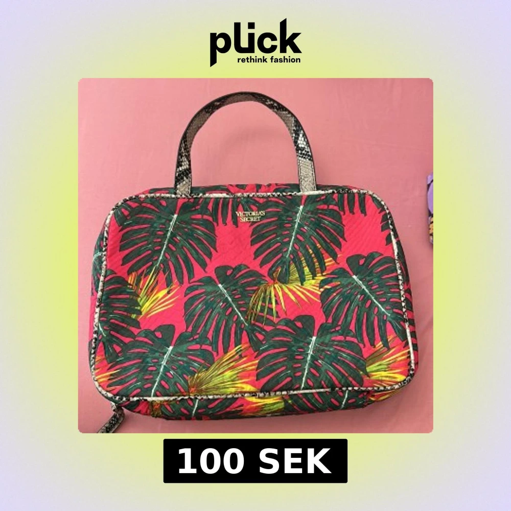 Necessär från Victoria's Secret med tropiskt bladprint i grönt och gult på rosa bakgrund. Ormönstrade handtag och detaljer, flera genomskinliga fack med dragkedja och en avtagbar svart innerficka. Perfekt för att organisera smink eller hudvård på resan.