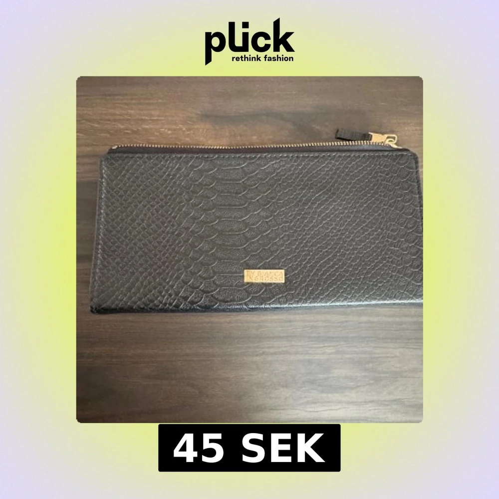Snygg svart plånbok med ormskinnsmönster från Bianca Ingrosso. Den har en praktisk dragkedja och en elegant guldlogga på framsidan. Perfekt för att hålla ordning på dina kort och kontanter.