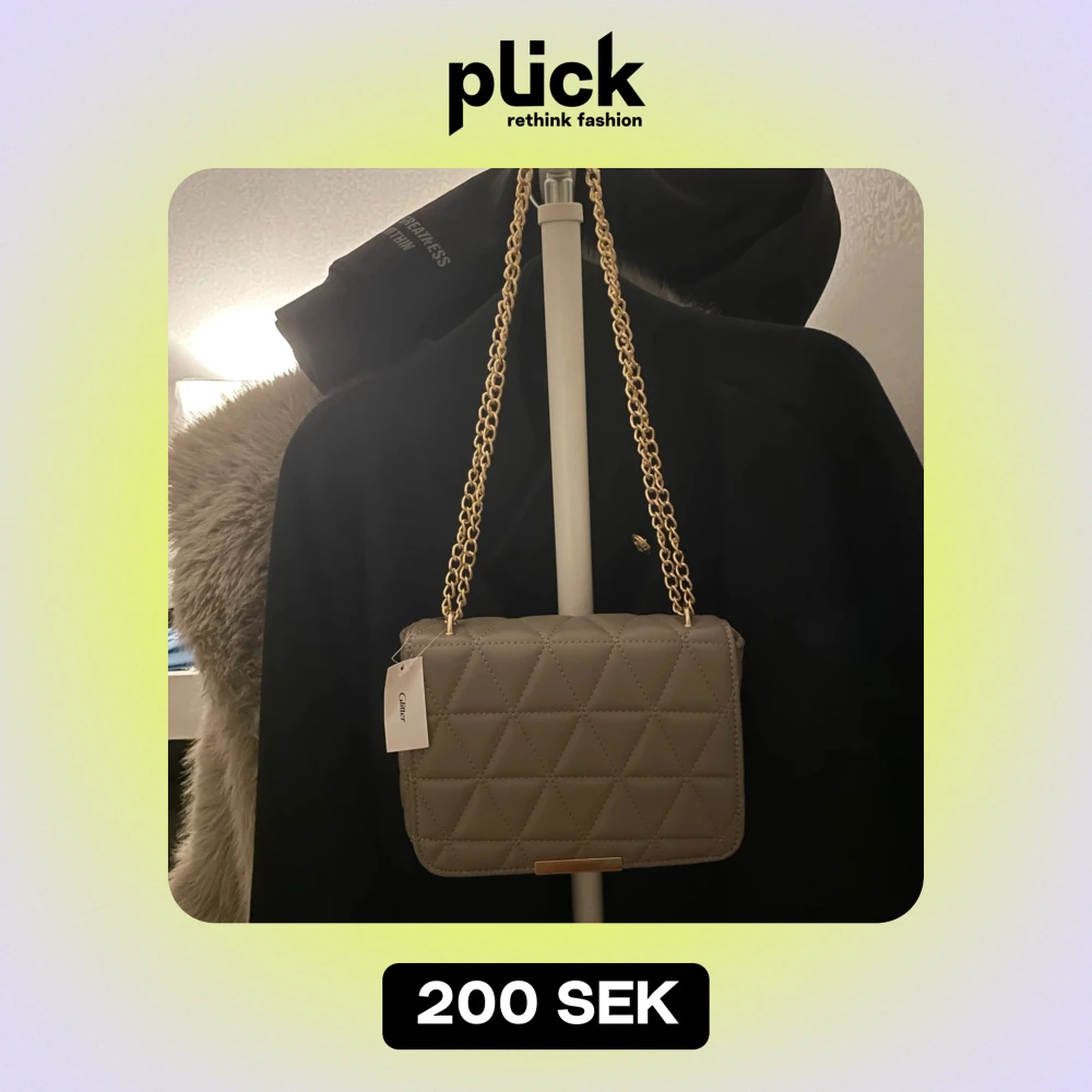 Från Glitter. Väskan har en elegant guldkedja som axelrem och en stilren design med triangulärt mönster. Perfekt för både vardag och fest! Den är i nytt skick och har fortfarande prislappen kvar.