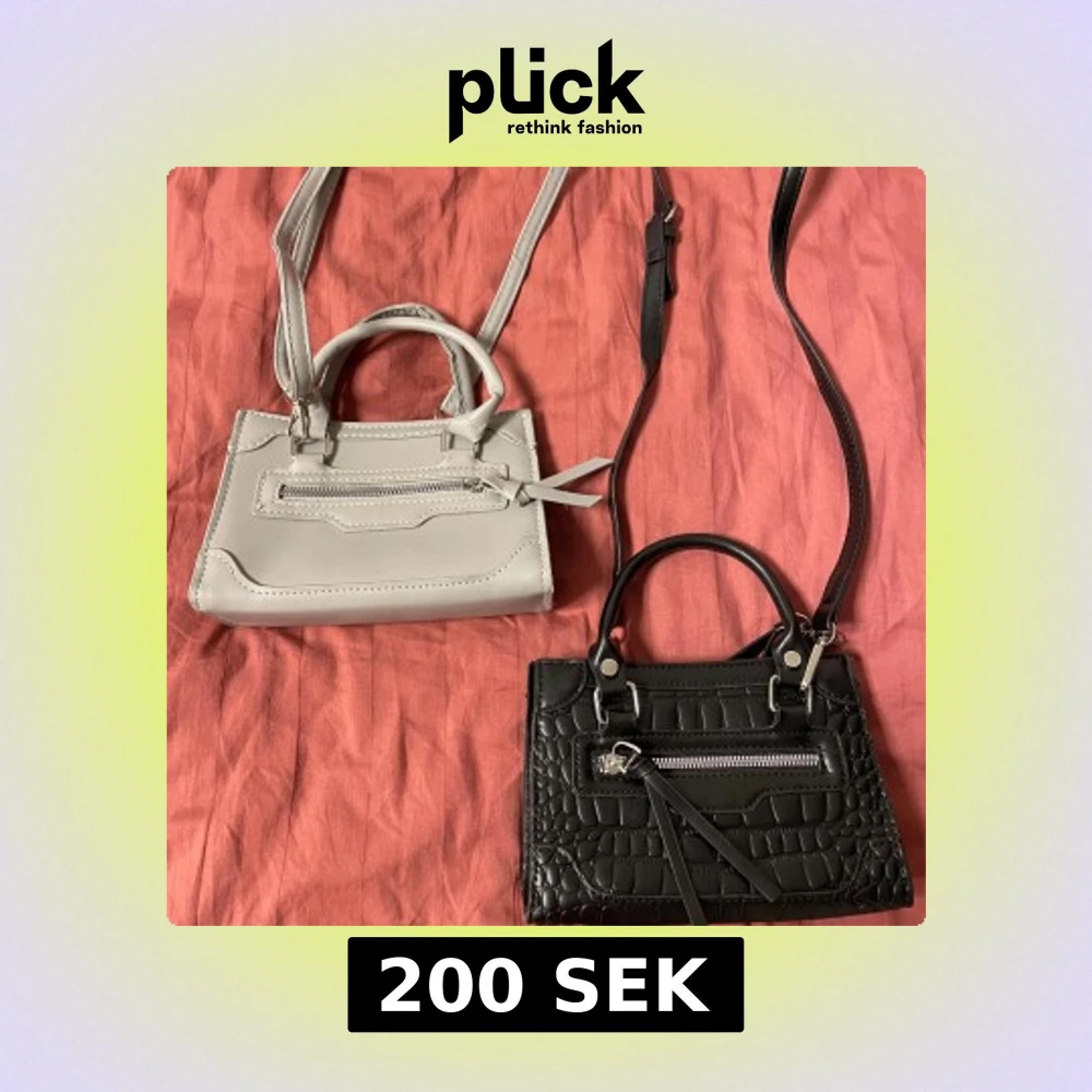 Säljer två stilrena små handväskor med axelrem, en i ljusgrått och en i svart med croco-mönster. Båda har dragkedja framtill och snygga detaljer. Perfekta och tuffa. Aldrig använda