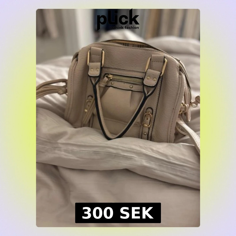 Säljer en beige axelväska i skinnimitation med guldfärgade metalldetaljer och dragkedja framtill. Väskan har både handtag och justerbar axelrem, samt dekorativa spännen och tofsar på sidorna. Perfekt storlek för det viktigaste och snygg design.