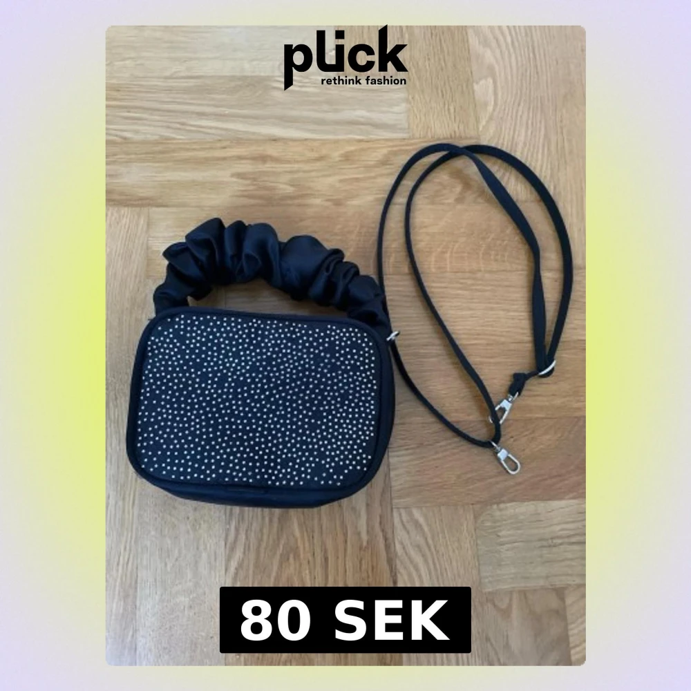 Svart handväska/axelväska med strasstenar på framsidan. Perfekt för att addera lite extra bling till din outfit. Handtaget är brett och scrunchat i satinliknande material, och väskan har även en smal axelrem som kan tas av.