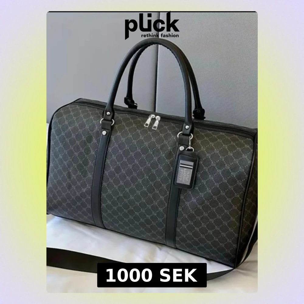 Snygg svart resväska med klassiskt monogrammönster och detaljer i svart skinn. Väskan har dubbla handtag, avtagbar axelrem och dragkedja upptill. Perfekt för weekendresor och har en stilren, modern look.