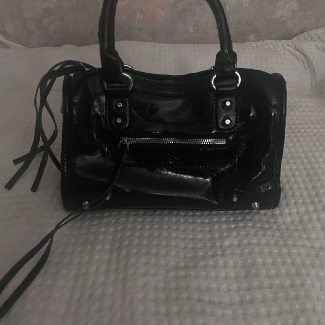 Cool svart handväska i glansigt skinnliknande material med silvriga detaljer och dragkedja framtill. Väskan har både handtag och en lång axelrem samt dekorativa remmar. Invändigt finns ett fack med dragkedja för småsaker.