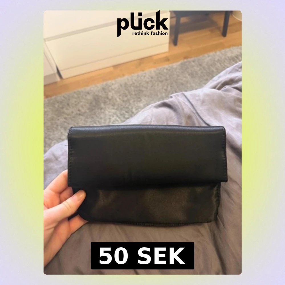 Stilren svart kuvertväska med magnetlås. Väskan har två fack på insidan och en enkel, rektangulär form.