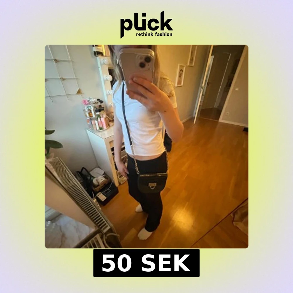 Säljer en svart axelväska med guldfärgad kedja och snyggt guldlås framtill. Väskan är liten och smidig, perfekt för det viktigaste. Stilren design med rektangulär form och justerbar axelrem.