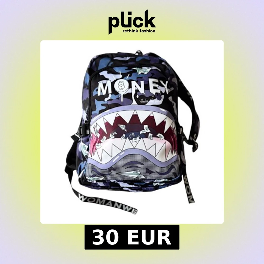 Cool ryggsäck från Womanwe med blå, lila och svarta camouflage-mönster och ett stort hajmotiv med tänder och sedlar. Texten 'MONEY' syns på framsidan. Justerbara axelband med tryckt logga och flera fack med dragkedja. Perfekt för dig som vill sticka ut.
