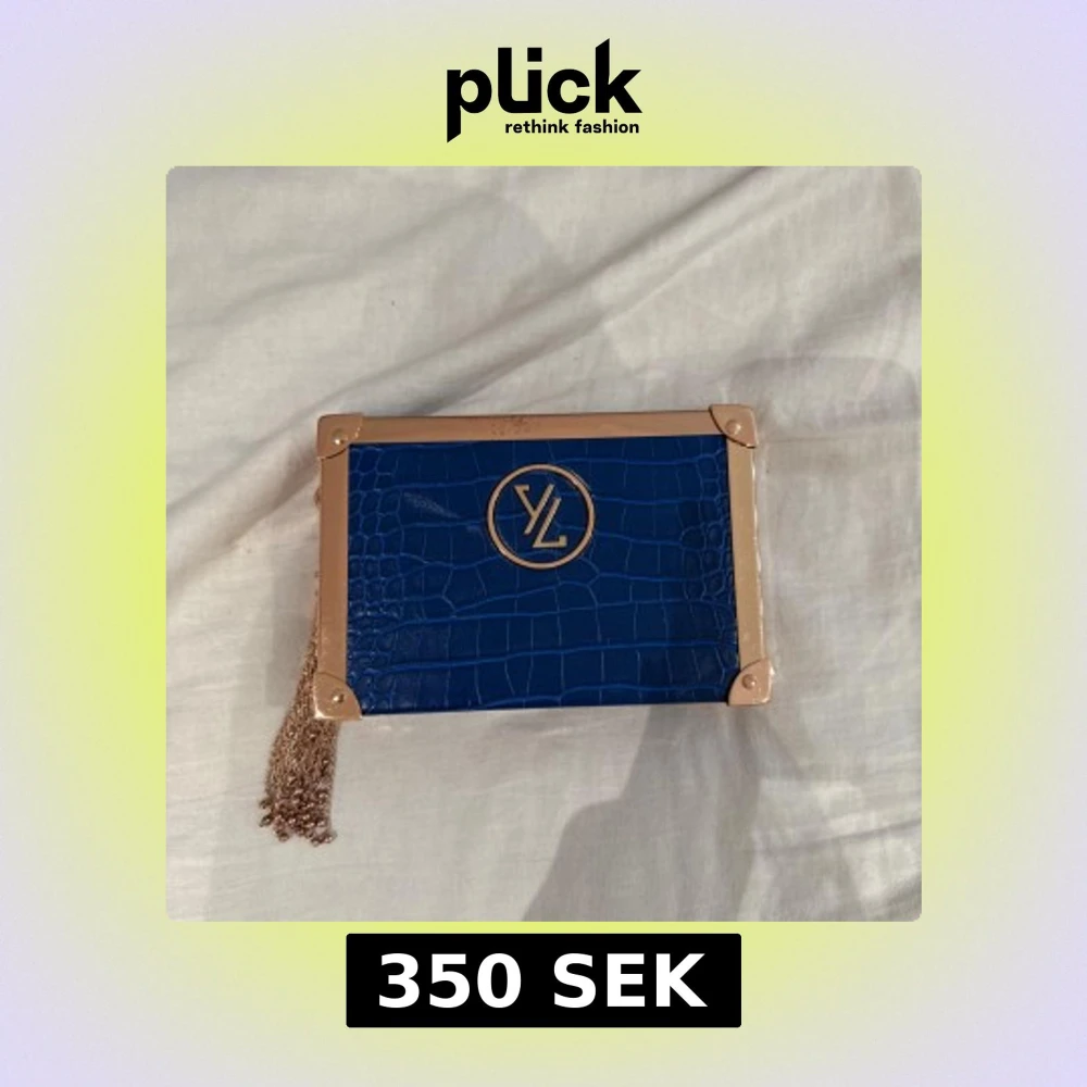 blå kuvertväska från Yves Lansac med krokopräglat mönster och guldfärgade metalldetaljer. Väskan har en kedjerem i guld och en boxig form.