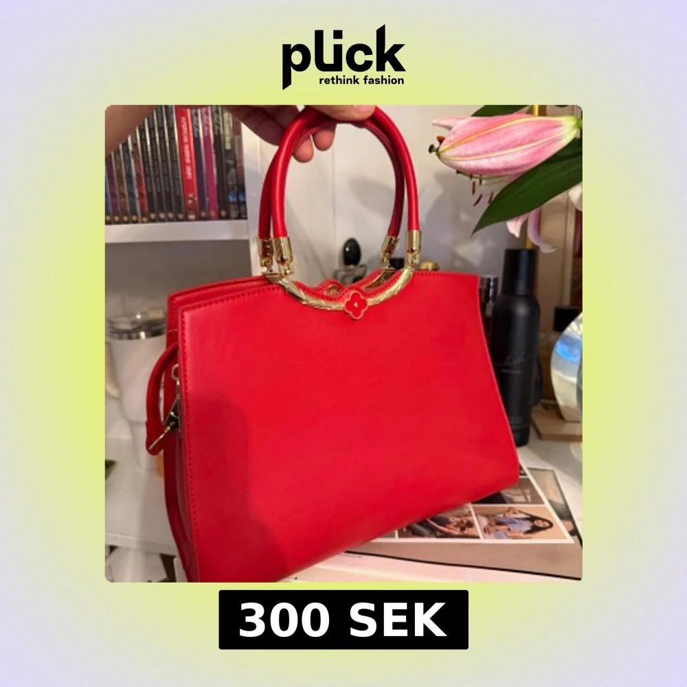 Snygg röd handväska i skinn med stilrena gulddetaljer och dekorativt handtag. Väskan har en klassisk, fyrkantig form och ett elegant blommotiv i metall vid handtaget. Perfekt accessoar för att lyfta din outfit.