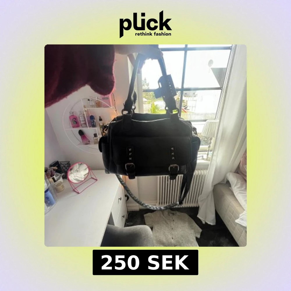 Säljer en svart axelväska i skinn med coola detaljer som nitar och spännen framtill. Väskan har både handtag och axelrem, perfekt för att bära på olika sätt. Snygg och rymlig modell som passar till det mesta. Från SHEIN ❤️