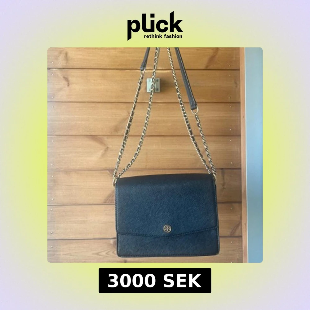 Snygg svart axelväska från Tory Burch i skinn med guldfärgade kedjedetaljer. Väskan har en stilren, fyrkantig form och ett litet logomärke framtill. Perfekt storlek för det viktigaste och en klassisk look som passar till många outfits.